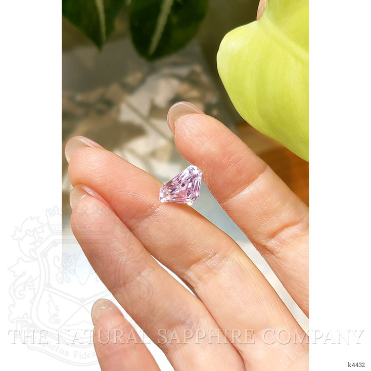 The remarkable pink kunzite presented here vividly demonstrates the captivating complexities inherent in nature's artistry. This transparent gemstone, weighing precisely 5.54 carats with exquisite proportions of 8.18 x 14.03 x 7.99 mm, draws the eye with its unique shape and enchanting hue. Characterized by a distinctive step cut, this kunzite maximizes the play of light across its facets, producing a gentle shimmer that enhances the gemstone's understated elegance. Its clarity is rated as very slightly included. This indicates that while minor inclusions may exist, they are scarcely visible at eye level and do not detract from the inherent charm of the stone.