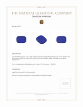The opaque 2.02 carat cushion-shaped blue lapis lazuli from The Natural Gemstone Company embodies both beauty and durability with an impressive profile of specifications. At dimensions of 12.39 x 10.84 x 1.34 mm, this lapis lazuli exemplifies both visual appeal and meticulous craftsmanship. Its cushion shape brings a classic elegance, complemented by an expertly executed tablet cut that enhances its natural luster. Known for its vivid color intensity, this gemstone showcases a mesmerizing deep blue hue that is further accentuated by the saturation and tone inherent in its composition. Sourced from Afghanistan, this origin is renowned for producing lapis lazuli of exceptional beauty and outstanding quality.