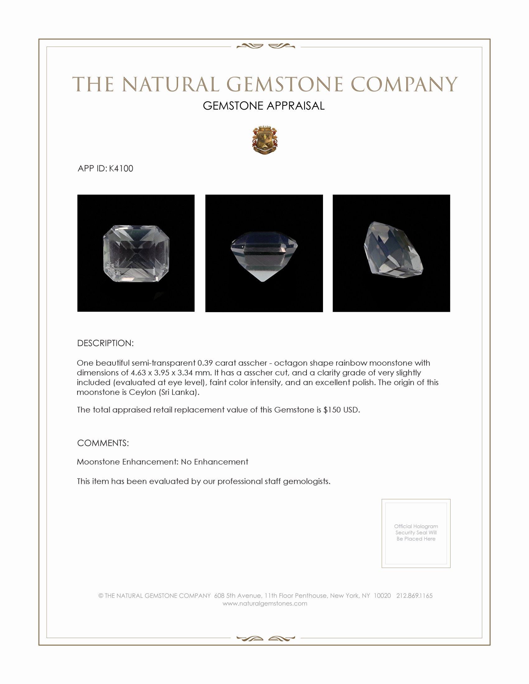 Introducing a truly enchanting gem that sets itself apart from the multitude of choices on the market. The Natural Gemstone Company is proud to present our exquisite semi-transparent 0.39 carat Asscher-cut rainbow moonstone, sourced from the renowned gem-producing regions of Ceylon in Sri Lanka. This moonstone is a testament to the exceptional expertise and quality that we offer, positioning itself as a superior choice for connoisseurs and collectors alike.