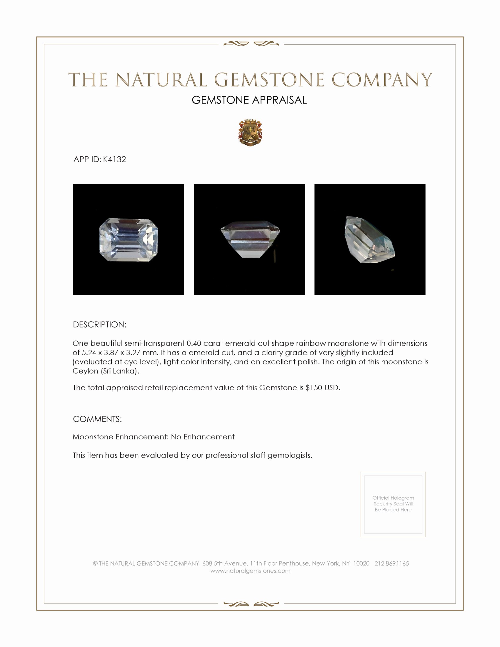 In the exquisite world of fine jewelry, where timeless elegance meets innovative craftsmanship, the captivating 0.40 carat emerald cut rainbow moonstone from The Natural Gemstone Company emerges as an unparalleled testament to one's unique taste and sophistication. This enchanting gem, with its dimensions of 5.24 x 3.87 x 3.27 mm, transcends ordinary stones with an ethereal beauty that whispers elegance and whispers luxury while inviting you to experience an unparalleled world of opulence. The moonstone's semi-transparent allure and its slightly included clarity evoke a gentle mystique, reminiscent of the moon's glow gently dappling the midnight ocean. Its origins lie in the rich, fertile lands of Ceylon, known today as Sri Lanka, a provenance synonymous with superior gemstone quality and history, further enriching the narrative of this extraordinary jewel. This divine specimen of rainbow moonstone is more than just a gem, it is a canvas upon which dreams of personalization and expression are delicately painted.