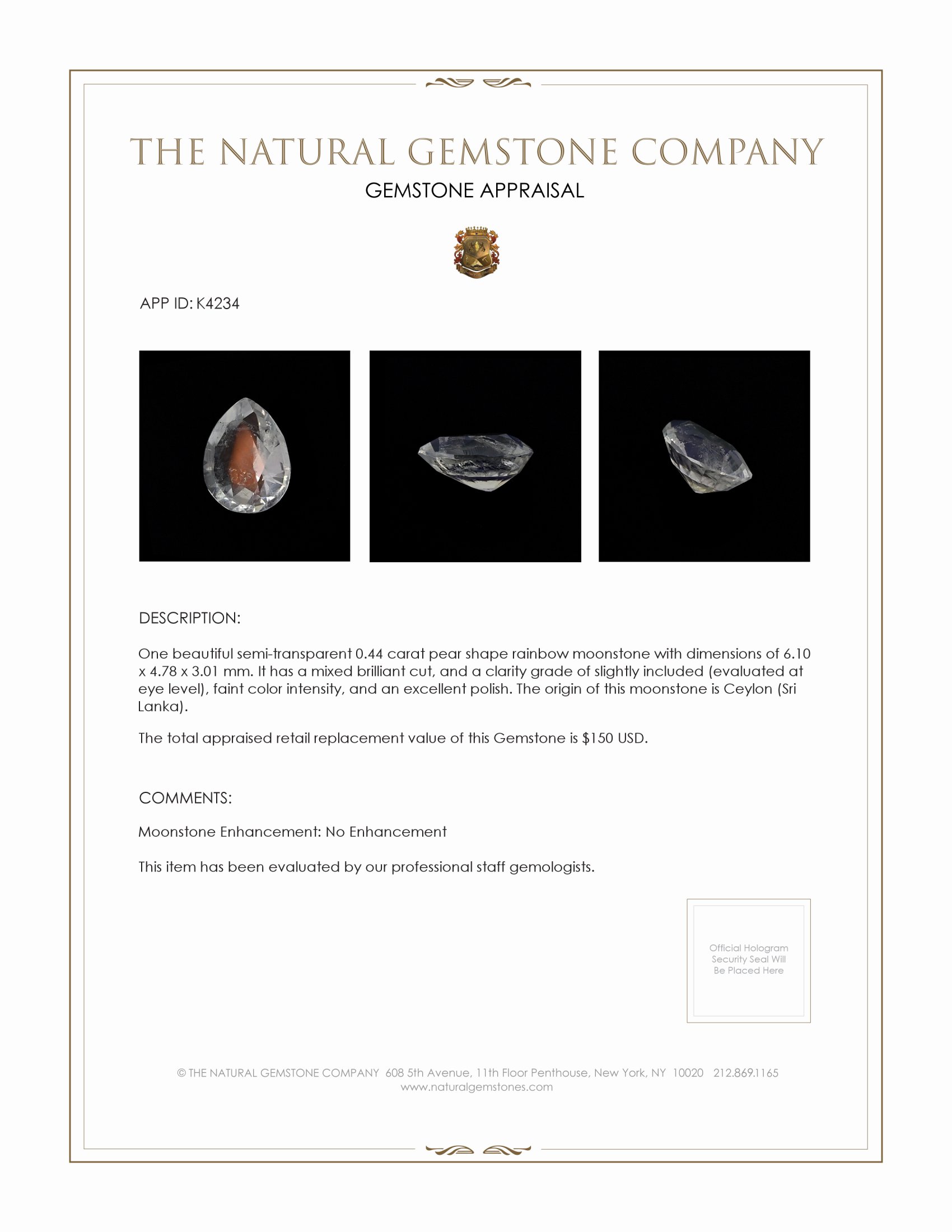 In the heart of the storied landscapes of Ceylon, where the softened whispers of the sea caress the land with ancient songs, lies the secret to a romance that transcends time. This one beautiful semi-transparent pear-shaped rainbow moonstone, an ethereal gem weighing 0.44 carats, harnesses the very essence of those mystical shores. Bathed in the moon's gentle embrace, it emerges as a dream wrapped in faint colors, its brilliance unfolding like a serenade at twilight. Our creation at The Natural Gemstone Company captures this magic, preserving an eternal dance between light and stone as histories unravel and leap forward in romance and light.