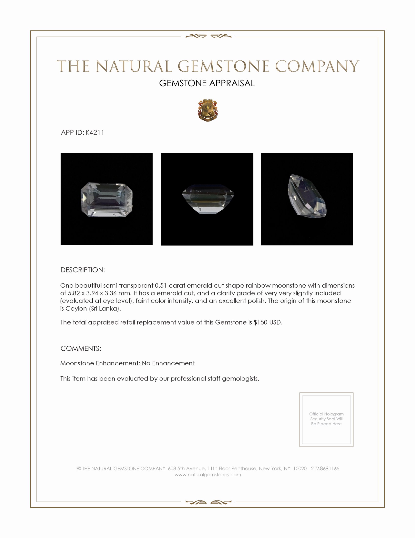 The Natural Gemstone Company proudly presents an exquisite gem that stands apart in the world of fine jewelry, the semi-transparent 0.51 carat emerald cut rainbow moonstone. Unlike many gemstones available on the market, this moonstone is distinguished by its exceptional clarity and subtle elegance. With dimensions of 5.82 x 3.94 x 3.36 mm, it captures attention with an understated yet captivating presence. What truly sets this moonstone apart is its origin from the mystical landscapes of Ceylon, renowned for producing gemstones of superior quality. This moonstone is graded as very very slightly included at eye level, a testament to its near-pristine condition and the meticulous craftsmanship involved in its creation.