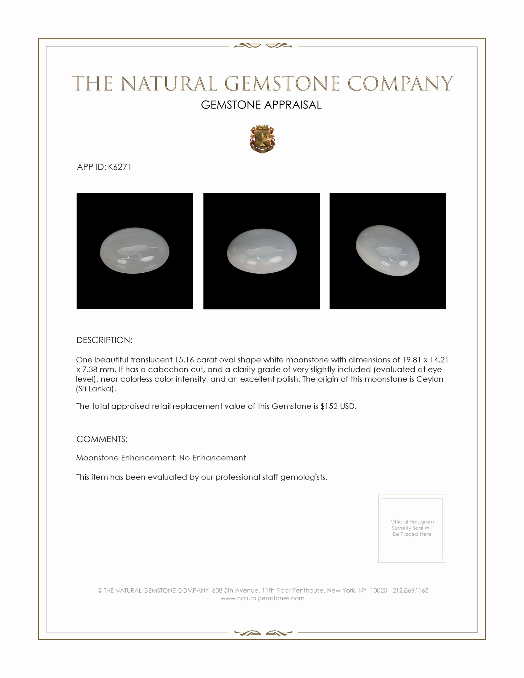 In the heart of the lush landscapes of Sri Lanka, where the earth caresses the sky, lies the genesis of a wonder—a moonstone of ethereal beauty. Bathed in the serene luminescence of the moon, this 15.16 carat white moonstone is a whisper of mystery and celestial allure. With dimensions that reflect the elegance of a celestial dance, 19.81 x 14.21 x 7.38 mm, it emerges as a silent testament to nature’s artistry.