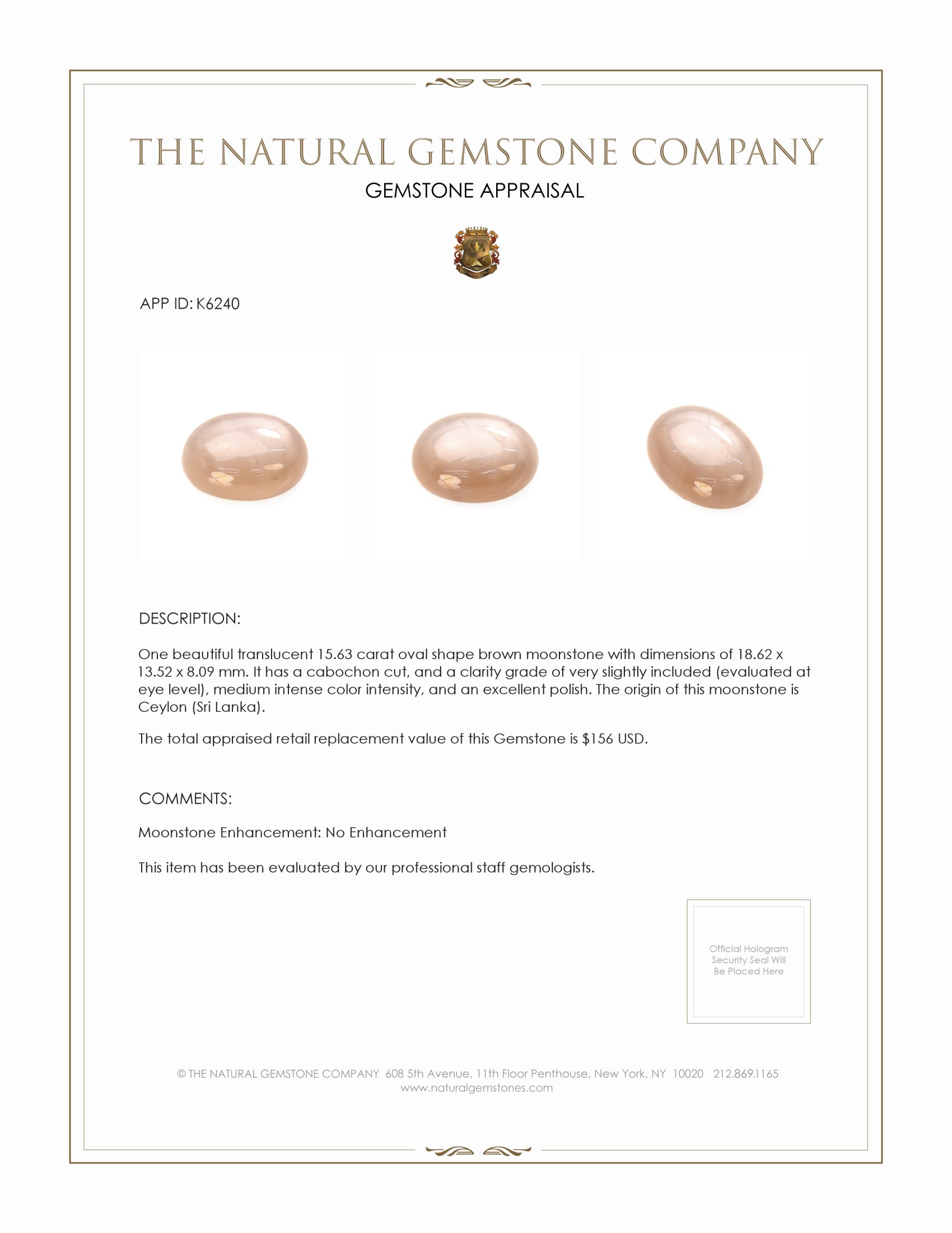 Finding the perfect gemstone that captures both the beauty of nature and the excellence of craftsmanship can be a daunting task. However, your quest finds its fulfilling conclusion here with The Natural Gemstone Company's exceptional offering: a lovely 15.63-carat brown moonstone, with an exquisite fusion of history and natural allure. This moonstone, crafted into an oval shape with dimensions of 18.62 x 13.52 x 8.09 mm, is a treasure that speaks to those who appreciate the story behind each piece and desire an item as unique as their aspirations.