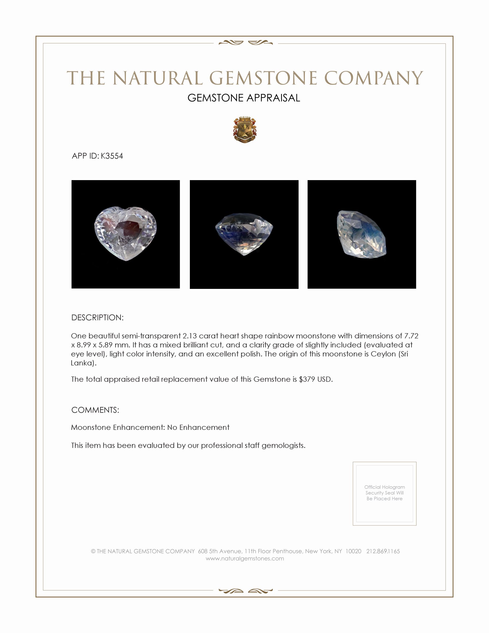 The Rainbow Moonstone offered by The Natural Gemstone Company is a captivating 2.13 carat gem that stands apart from more common gemstones due to its unique play of colors and history intertwined with its origins. Expertly cut into a heart shape with dimensions of 7.72 x 8.99 x 5.89 mm and a mixed brilliant cut, this gemstone promises to capture the light beautifully and reflect it back with an enchanting allure. One of the most striking features of this moonstone is its adularescence, a phenomenon that gives the stone an ethereal glow akin to that of moonlight on water. This natural wonder aligns with its semi-transparent quality and grading of slightly included clarity, offering the perfect blend of mystique and allure without compromising its transmissive qualities.