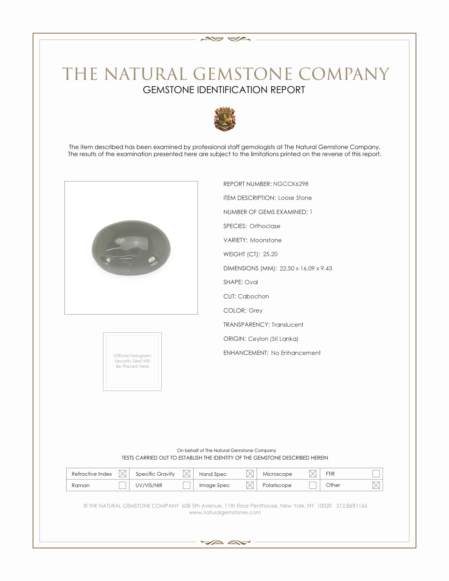 Introducing an exquisite 25.20 carat grey moonstone, exclusively presented by The Natural Gemstone Company. This gemstone boasts a captivating oval shape with dimensions of 22.50 x 16.09 x 9.43 mm, making it ideally suited for custom jewelry designs that require a pivotal and striking centerpiece. Its cabochon cut enhances the moonstone’s smooth and polished surface, creating an incomparable translucence that shimmers with intense color intensity. Sourced from the renowned gemstone-rich regions of Ceylon, or present-day Sri Lanka, this moonstone carries an authentic heritage of superior quality, embodying a rich tradition of gemstone craftsmanship.