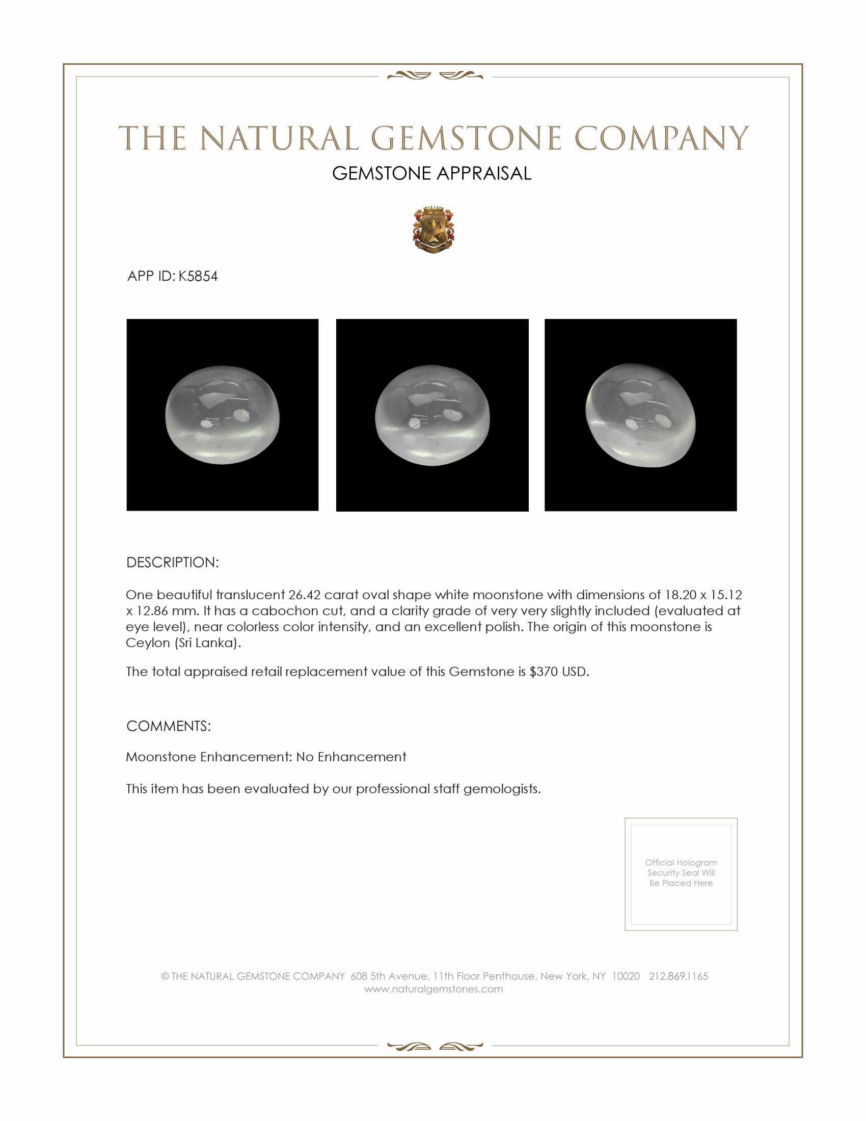 At The Natural Gemstone Company, we pride ourselves on offering jewels that resonate with history and mystery, and our 26.42 carat white moonstone is no exception. This exquisite gemstone, hailing from the lush landscapes of Ceylon, known today as Sri Lanka, embodies the timeless allure and tradition that has enchanted cultures for millennia. Its translucent beauty, shaped into an elegant oval measuring 18.20 x 15.12 x 12.86 mm, invites the eye into a world of tranquility and reflection. The cabochon cut enhances its serene surface, revealing the moonstone’s inner light with a clarity grade of very very slightly included at eye level. Unenhanced and untouched, this stone remains naturally near colorless, with an excellent polish that speaks to the exceptional craftsmanship we uphold.
