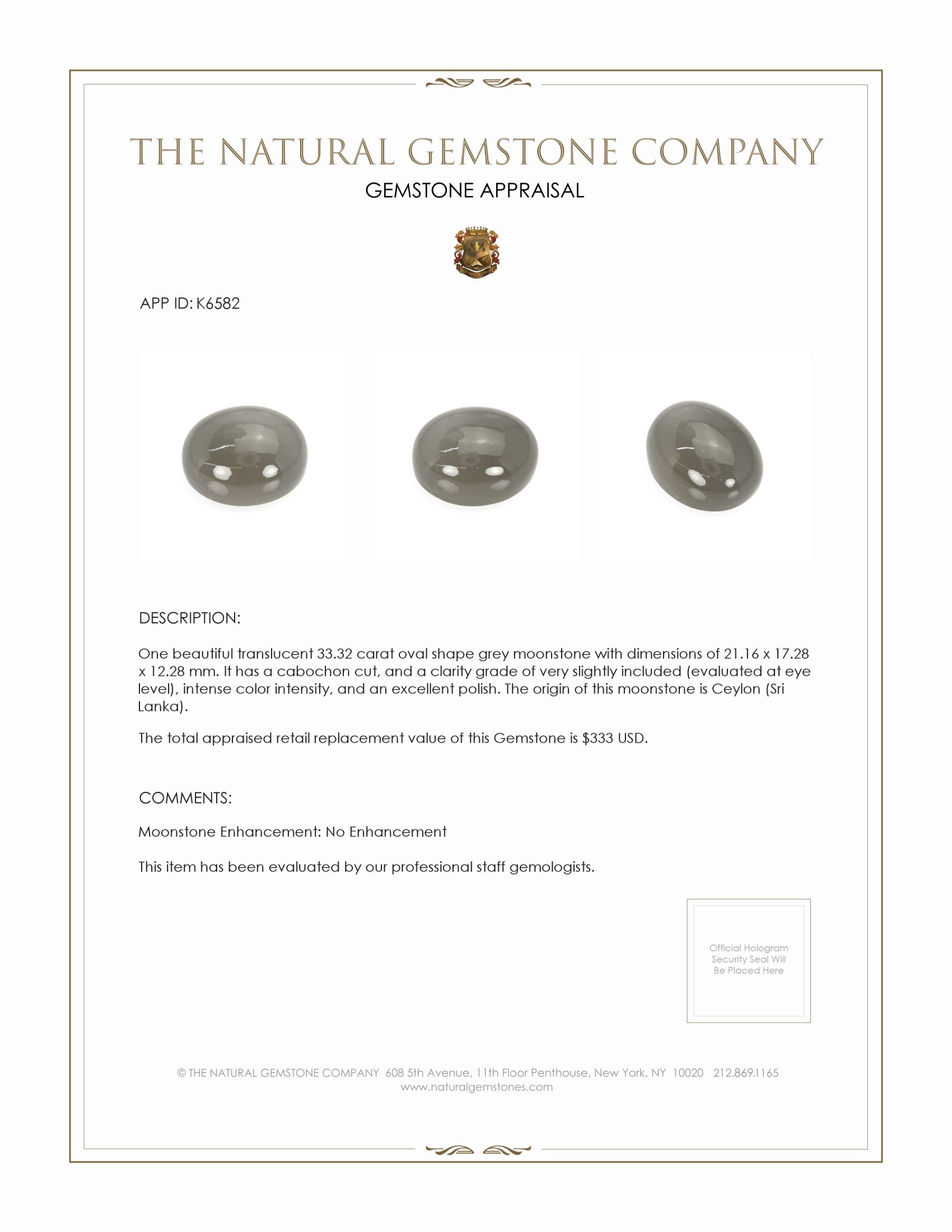 Presenting an exquisite offering from The Natural Gemstone Company, this luxurious grey moonstone epitomizes elegance and sophistication. Weighing an impressive 33.32 carats, this remarkable gemstone is shaped into a refined oval silhouette, measuring 21.16 x 17.28 x 12.28 mm. Its translucent allure is embodied through a masterfully crafted cabochon cut, ideal for showcasing the stone’s distinctive visual properties. The moonstone’s clarity, graded as very slightly included when evaluated at eye level, reflects its superior quality and high-grade origin.