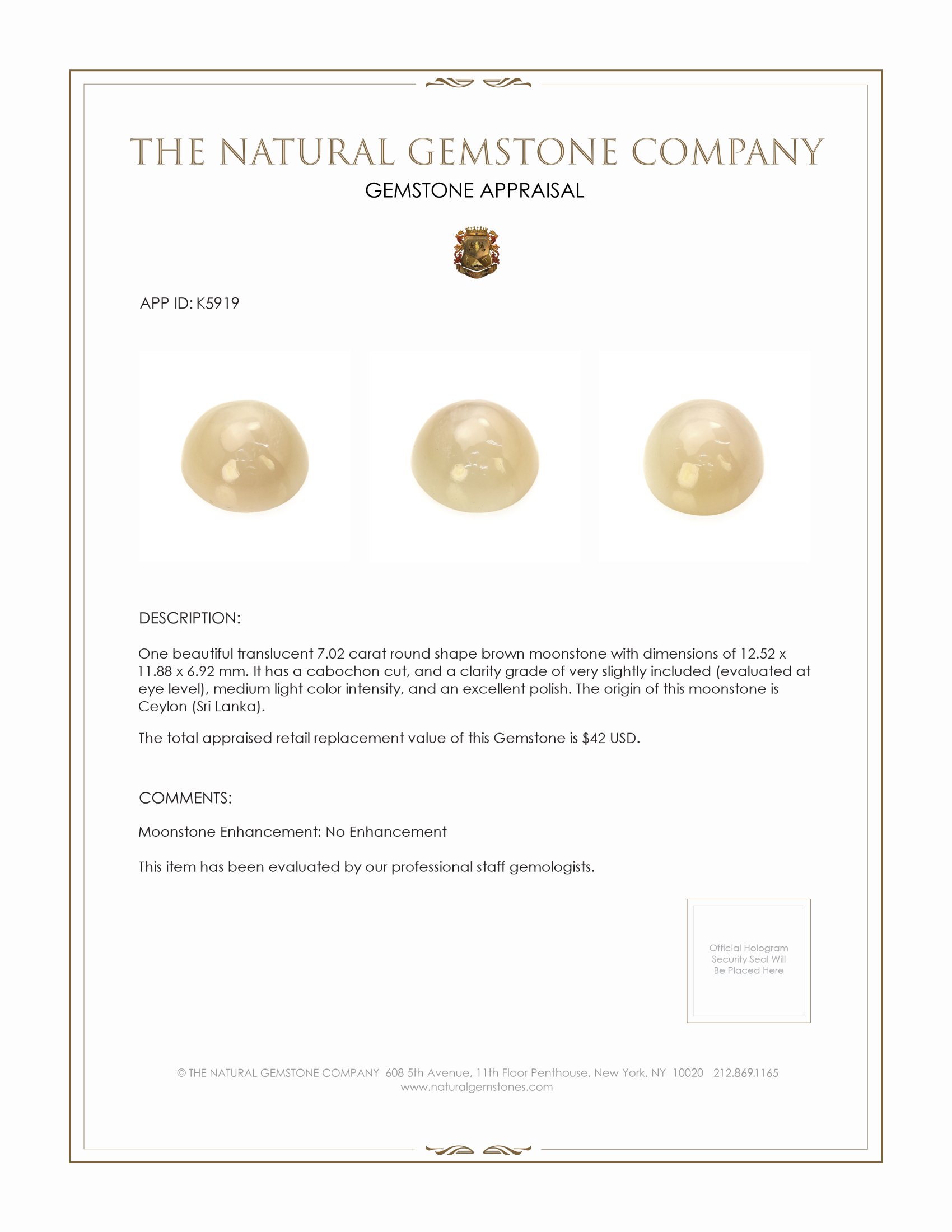 Introducing an exquisite addition to your jewelry collection from The Natural Gemstone Company: a stunning 7.02 carat round shape brown moonstone. With its fascinating play of light and enchanting medium light color intensity, this moonstone is a captivating choice for any jewelry enthusiast. The stone measures 12.52 x 11.88 x 6.92 mm and features a cabochon cut, enhancing its unique visual properties and making it a remarkable piece that reflects sophistication and elegance. Expertly crafted, it showcases an excellent polish, ensuring a smooth surface that gleams with every movement.
