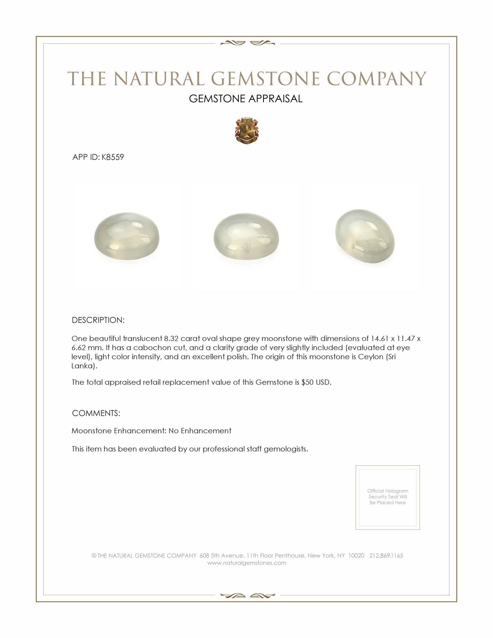 Introducing a captivating gemstone from The Natural Gemstone Company, we present an exquisite 8.32 carat grey moonstone. Featuring an elegant oval shape and measuring 14.61 x 11.47 x 6.62 mm, this moonstone stands out for its remarkable translucence and delicate appearance. The cabochon cut enhances its inherent beauty, creating an enchanting surface that plays with light in subtle and sophisticated ways. With a clarity grade of very slightly included, assessed at eye level, this gemstone offers a pristine view that captures and holds attention, making it an ideal centerpiece for fine jewelry.