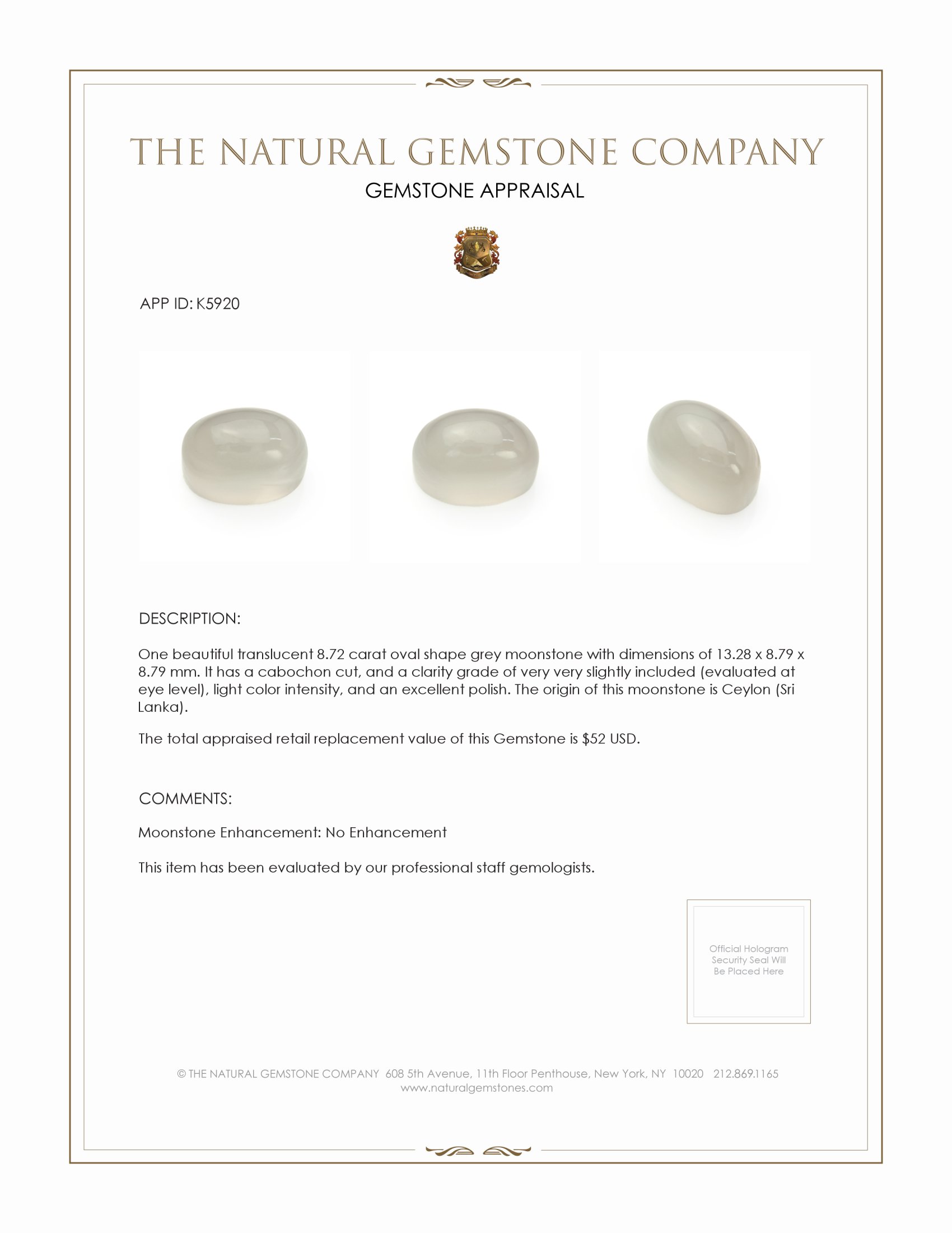 Discover the ethereal charm of our exquisite translucent 8.72 carat oval grey moonstone, crafted meticulously to meet the desires of gemstone enthusiasts and collectors. At The Natural Gemstone Company, we understand your pursuit of perfection, and this gemstone stands as an embodiment of unique beauty and rarity. Sourced from the illustrious mines of Ceylon, now known as Sri Lanka, this moonstone boasts an elegant cabochon cut, accentuating its innate luminescence and captivating glow. Its dimensions, measuring 13.28 x 8.79 x 8.79 mm, alongside a fantastic polish, ensure this gem radiates elegance and serenity, making it a perfect addition to luxury jewelry or a treasured heirloom for discerning collectors.