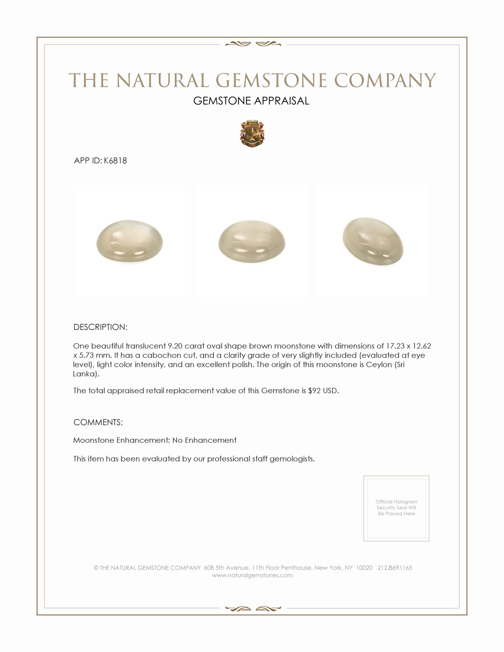 Embrace the allure of a storied treasure with our exquisite 9.20 carat brown moonstone, a gem as timeless as the first blush of dawn. Crafted in the alluring dance of shadows and light, its gentle visage captures the soul much like the moonlight embracing the calm sea. With origins deep within the fabled landscapes of Ceylon, today known as Sri Lanka, this moonstone is a whisper from the past, a testament to the artistry of nature herself.