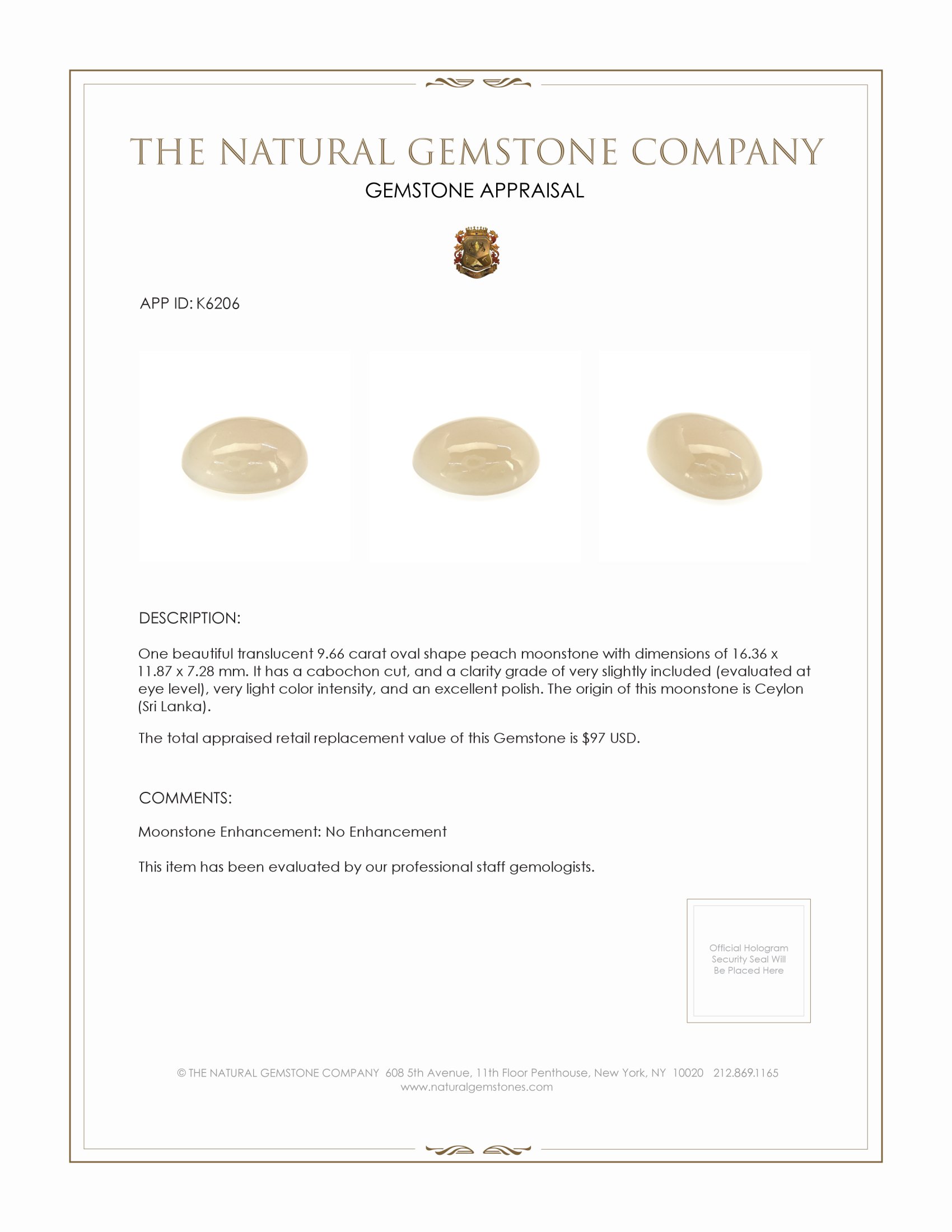 Harvested from the fertile grounds of Sri Lanka, the moonstone emerged into the daylight, its beauty hinting at the potential it would soon realize. Its appealing brown hue, medium in color intensity, is reminiscent of the rich earth from which it came. This moonstone is special, with a vibrant color that promises to stand out in any jewelry setting. With an impressive weight of 9.66 carats and dimensions measuring 16.36 x 11.87 x 7.28 mm, every aspect of this gemstone speaks echoes of its lustrous journey. It possesses an excellent polish that enhances its natural beauty and invites light to dance across its cabochon surface, creating an ethereal shimmer.