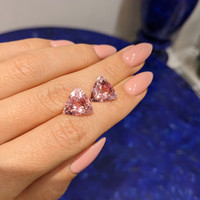 The stunning set of morganites, hailing from Brazil, features an exquisite pairing of transparent gems, weighing 3.36 and 4.10 carats. They showcase a unique trillion shape, with dimensions of 10.98 by 11.46 by 6.03 mm and 11.03 by 11.53 by 6.86 mm. Crafted with a mixed brilliant cut, these morganites exhibit an eye-clean clarity, ensuring a flawless visual appeal. Their medium intense pink color enhances their allure, capturing light with an excellent polish that speaks to their refined craftsmanship. The design potential of these stones is immense, due to their precise cut and vibrant hue. When integrated into a thoughtful composition, they contribute to a balanced, eye-catching design that is both elegant and sophisticated. This pair of morganites offers not only beauty but also a harmonious element to any setting, making them ideal for sophisticated jewelry pieces.