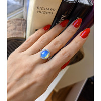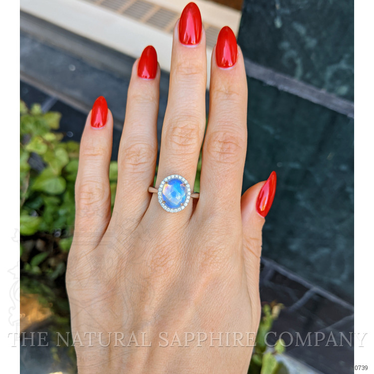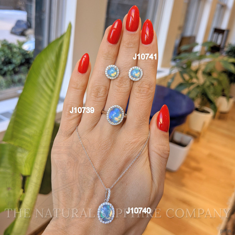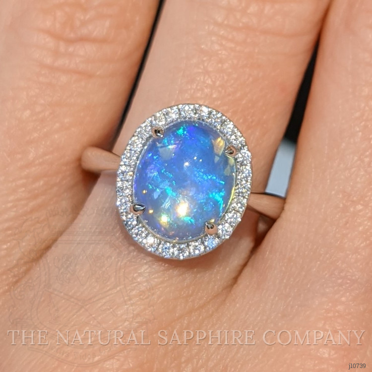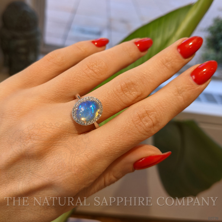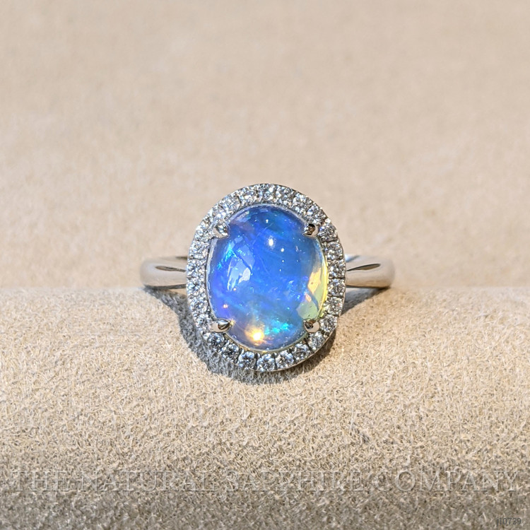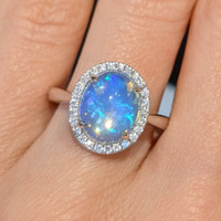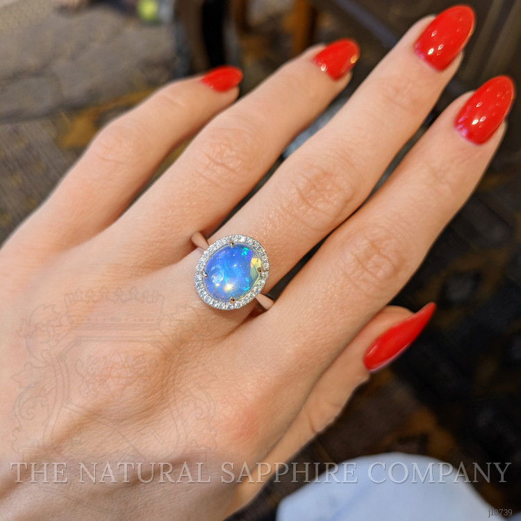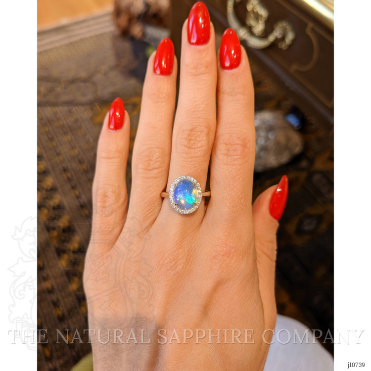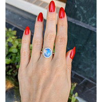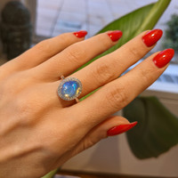 The opal, a stone of mystery and enchantment, rests gently in the embrace of a sparkling halo, each delicate diamond a shimmering testament to love's unwavering promise. As light caresses the gem, it awakens with a kaleidoscope of colors, reminiscent of dawn’s tender blush or the play of sunlit waves. This ring, tender yet striking, invites you to lose yourself in a world where dreams whisper secrets of eternity.