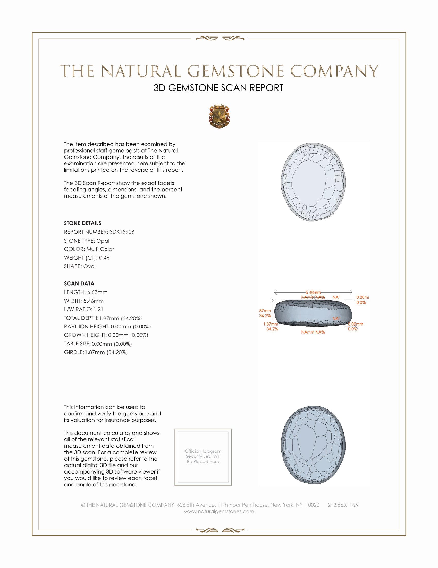 The charm of this opal lies in its sublime dimensions, measuring 6.63 x 5.46 x 1.87 mm. Its captivating form, perfected by a tablet cut, adds an element of sophistication that stands unequaled. With an exceptional clarity grade of very slightly included, noticeable only upon the keenest inspection at eye level, this gem transforms natural inclusions into unique attributes that highlight the opal’s authenticity. The brilliance of its intense color intensity creates a kaleidoscope of hues that dances with light, making this opal a true masterpiece of design and craftsmanship.