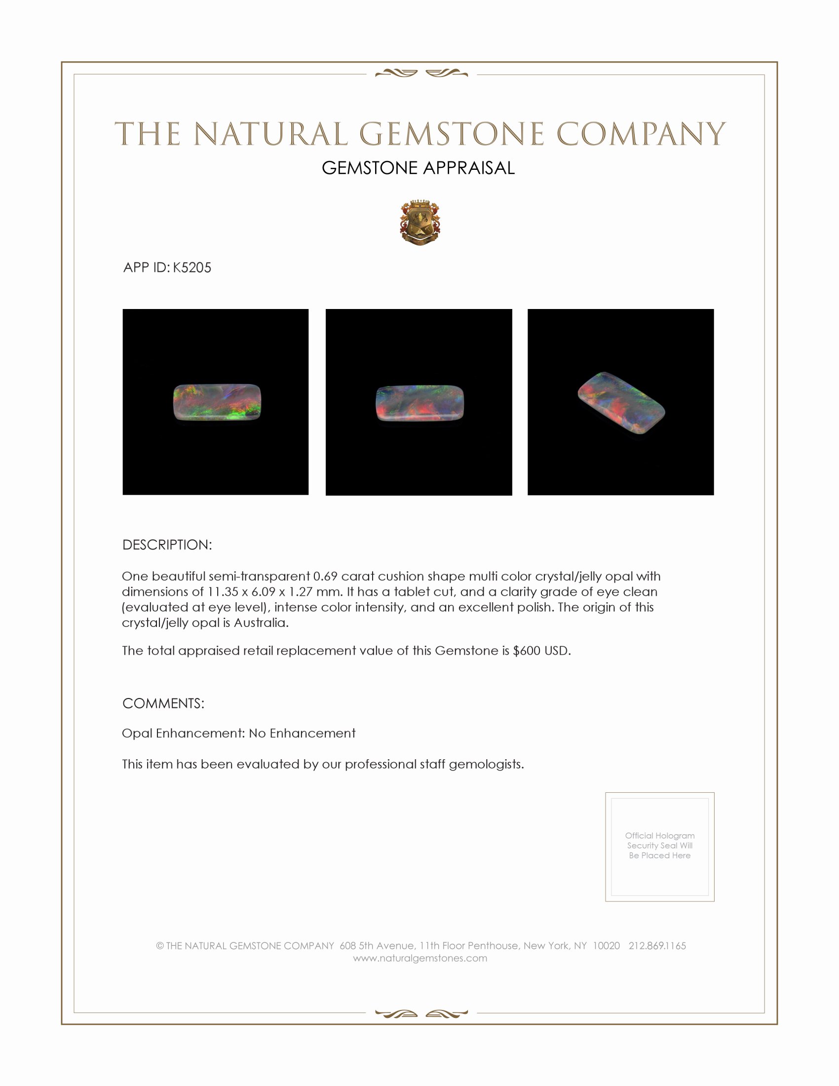 This semi-transparent opal displays an unparalleled depth of color that changes with the light, offering a unique visual experience that captivates the beholder. Its 0.69 carat weight, coupled with dimensions of 11.35 x 6.09 x 1.27 mm., makes it a gemstone of substantial presence without overwhelming delicacy. The elegant cushion shape complements the opal's multi-color palette, providing a balanced and harmonious appearance that resonates with collectors and enthusiasts alike.