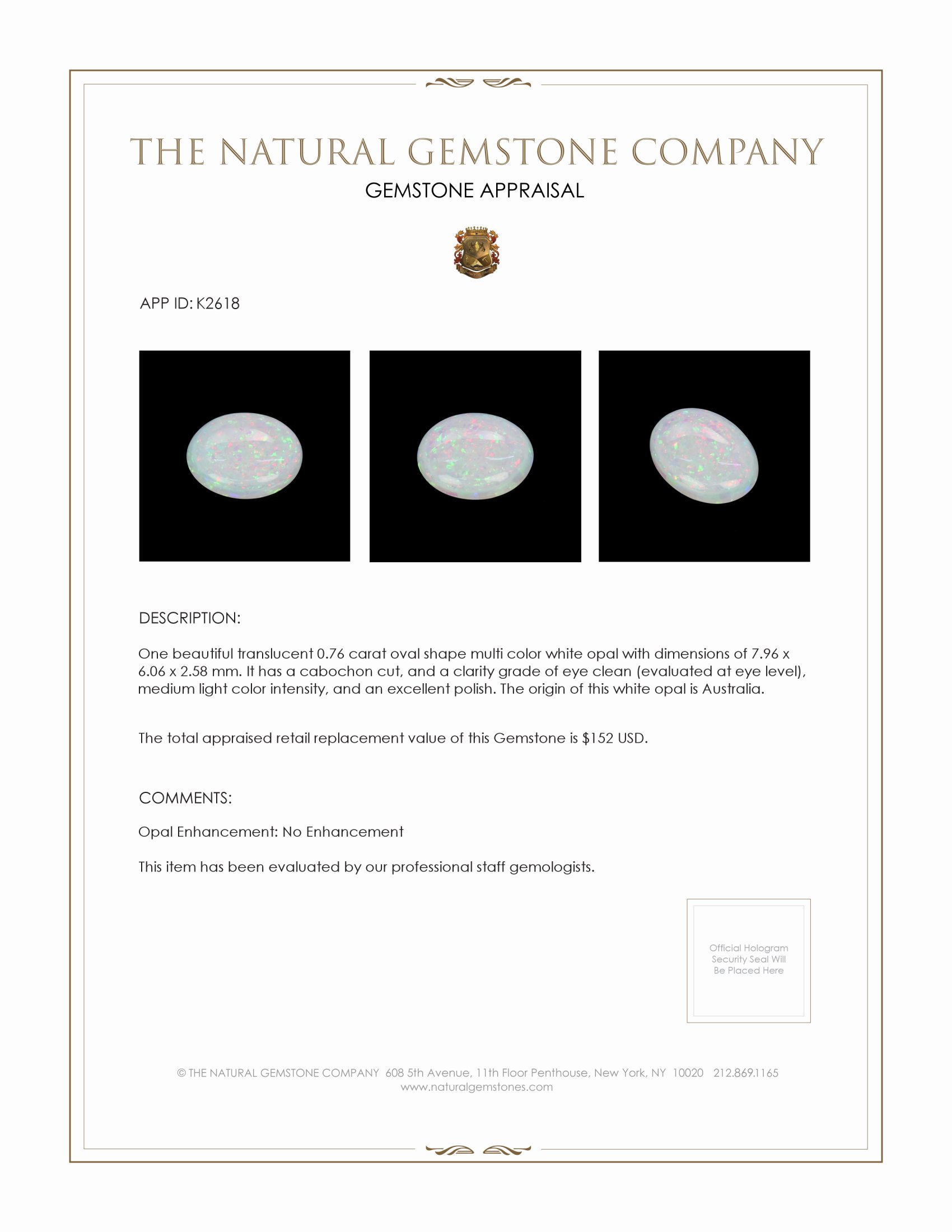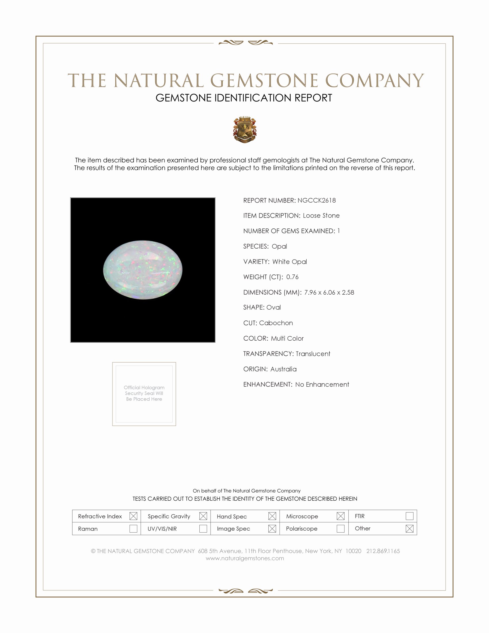 Discover the enchantment of a truly mesmerizing gemstone with our exquisite 0.76 carat oval-shaped multi-color opal from The Natural Gemstone Company. This opal embodies a symphony of colors that dance across its surface, captivating all who gaze upon it. With its dimensions of 7.96 x 6.06 x 2.58 mm, this splendid gem promises to be an exquisite addition to any jewelry collection, offering both rarity and beauty in equal measure. Its cabochon cut further enhances its allure, allowing the natural play of color to shine unimpeded, amplifying the opal's innate translucence and brilliance.