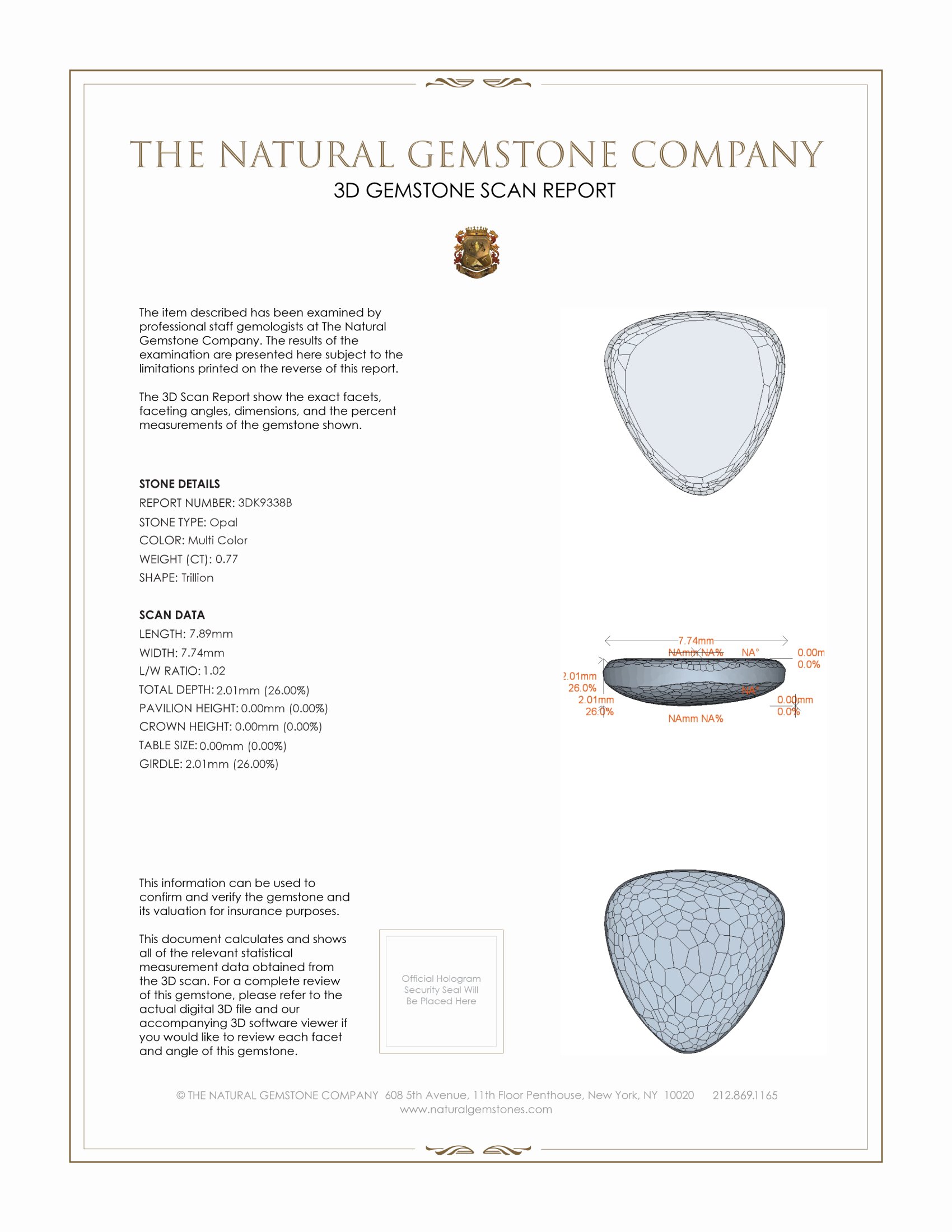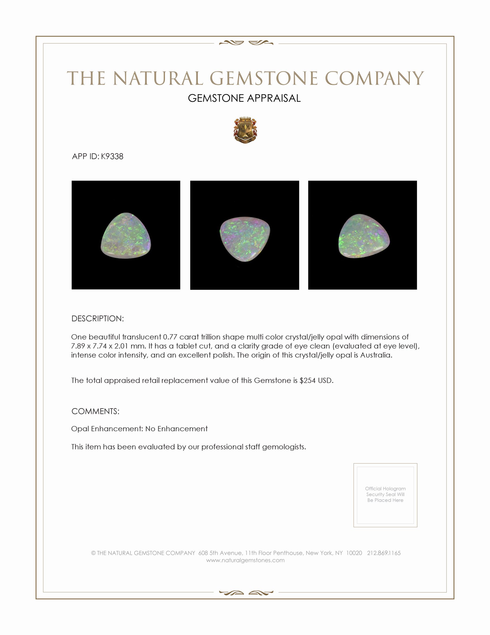 Experience a world of vibrant imagination with our transcendent multi-color opal, a true gem brought to life by nature's extraordinary artistry. Featuring a radiant array of kaleidoscope hues, this stunning crystal jelly opal weighs 0.77 carats, capturing thousands of years of history and global wonder within its treasured trillion shape. At The Natural Gemstone Company, we understand that a gemstone is more than just a piece of jewelry; it is an opportunity to connect with timeless beauty and transcend the ordinary. This remarkable opal, with dimensions of 7.89 x 7.74 x 2.01 mm, serves as an exquisite testament to what the Earth can draw from its vaults to speak directly to our emotions.