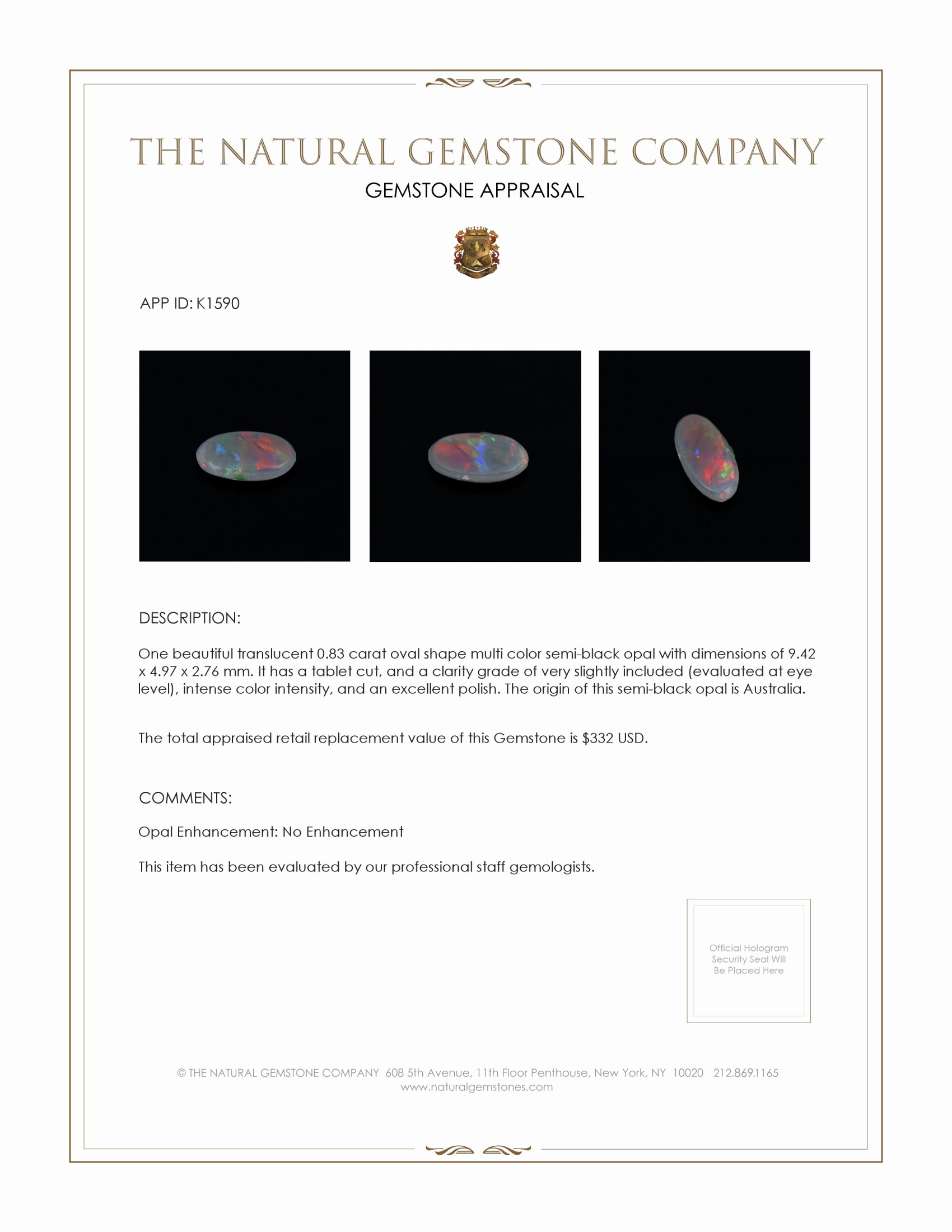 In the heart of dreams, where whispered secrets reside and the air shimmers gently with the promise of love, there lies a gem of unparalleled beauty—a multi-colored opal of hypnotic splendor from The Natural Gemstone Company. A semi-black opal, born beneath the vast Australian sky, this exquisite stone is a celebration of nature's palette, a delicate yet vibrant canvas carved by ages past. Measuring a modest 9.42 by 4.97 by 2.76 millimeters and weighing a mere 0.83 carats, it is a treasure steeped in myth and mystery. Its legacy is one of wandering rainbows frozen in time, with hues as evocative as the sunsets of long-ago summer eves.