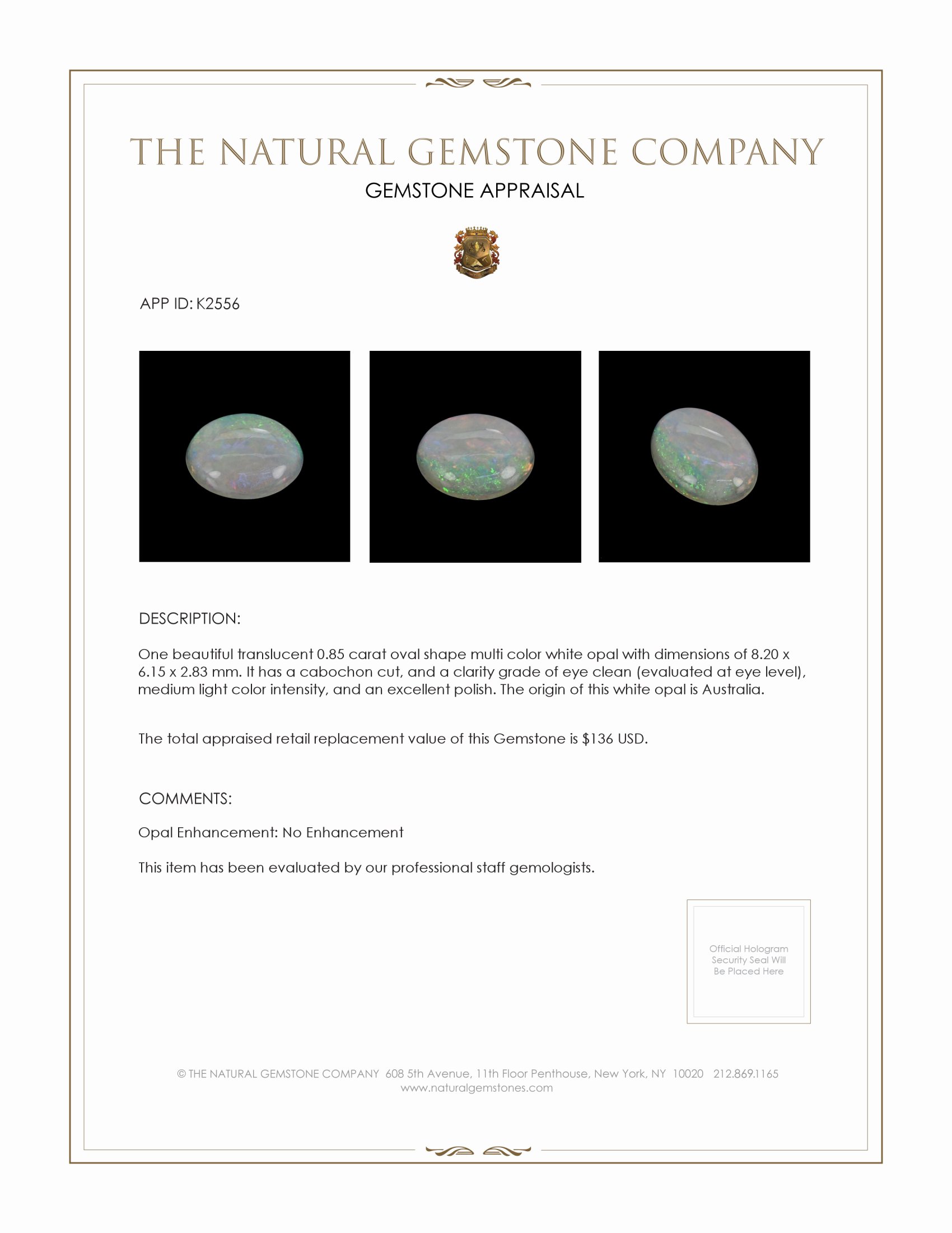Further adding to the opal's allure is its eye clean clarity grade, evaluated at eye level to reveal no visible inclusions. This clarity signifies the opal's exceptional translucence, allowing for an unobstructed appreciation of its dynamic color shifts. Accompanied by an excellent polish, the gemstone's surface achieves a mirror-like sheen which plays a pivotal role in enhancing its brilliance and luminous properties. The Natural Gemstone Company's commitment to quality and authenticity is encapsulated in this exquisite specimen, epitomizing the perfect synthesis of rarity, beauty, and enduring value, making it an esteemed choice for collectors and connoisseurs alike.
