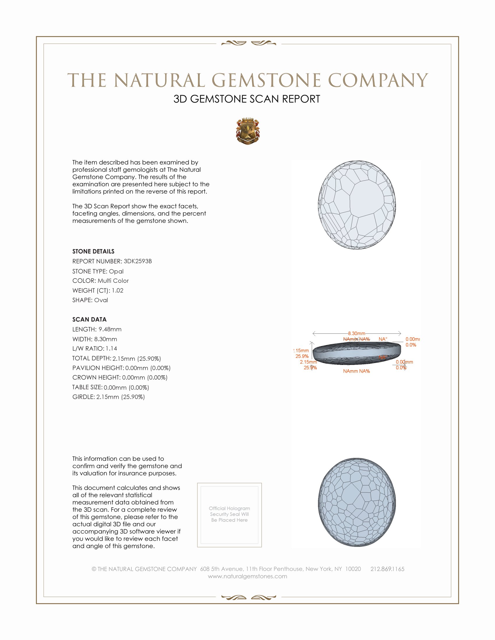 Introducing a remarkable addition to the world of gemstones, a truly stunning 1.02 carat opal of exceptional charm and beauty. This opal showcases a captivating oval shape with precise dimensions of 9.48 x 8.30 x 2.15 mm and exhibits an enchanting multi-color palette that is sure to allure any discerning connoisseur. As a semi-black opal, it offers a significant rarity among opal types, which further contributes to its value and allure. Originating from the renowned opal fields of Australia, this gem embodies the finest traditions of opal craftsmanship, presenting not only exquisite aesthetics but also a legacy of authenticity and skillful mining practices that The Natural Gemstone Company is proud to uphold.