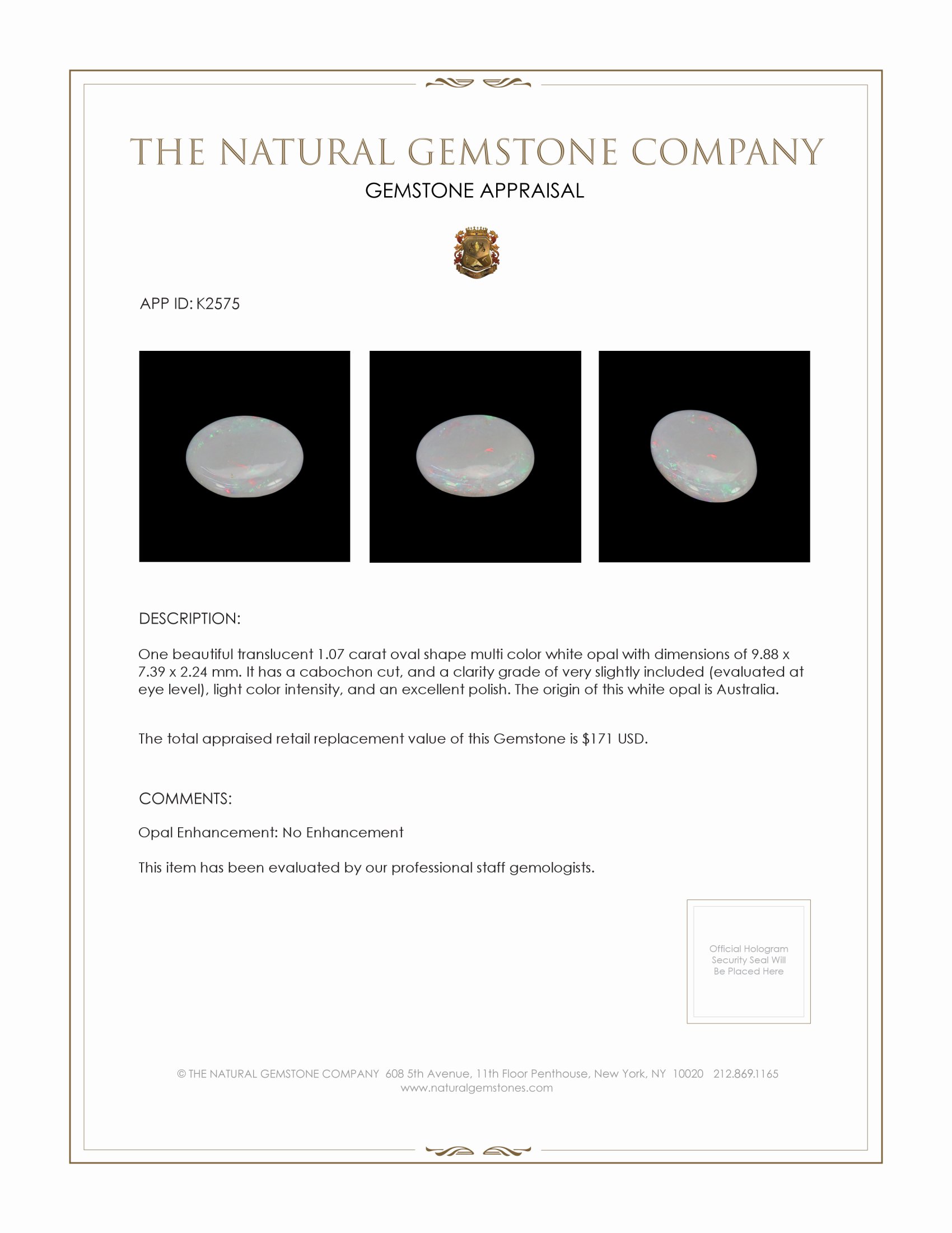 From the ancient depths of Australia's earth, where time itself weaves a tapestry of wonders, emerged a treasure destined to captivate hearts across millennia. This remarkable gemstone, a 1.07 carat oval-shaped opal, began its journey in the remote and untamed regions known for yielding nature's most exquisite marvels. Known as the White Opal, it was prized even in antiquity for its ethereal beauty and kaleidoscope of colors. With dimensions of 9.88 x 7.39 x 2.24 mm and a skilled cabochon cut, this unique opal captures the very essence of tradition and elegance in its serene embrace.
