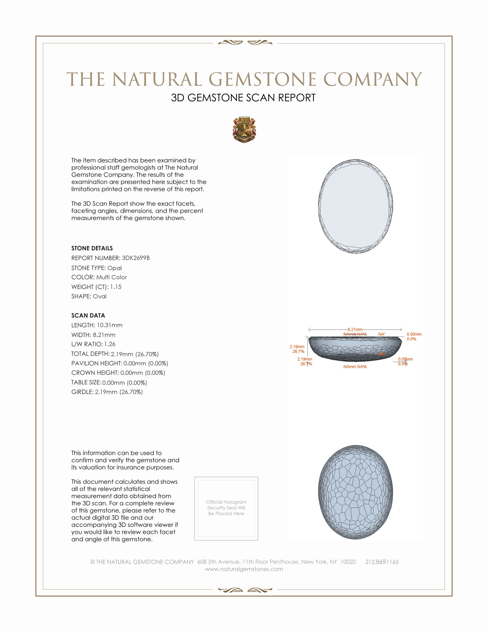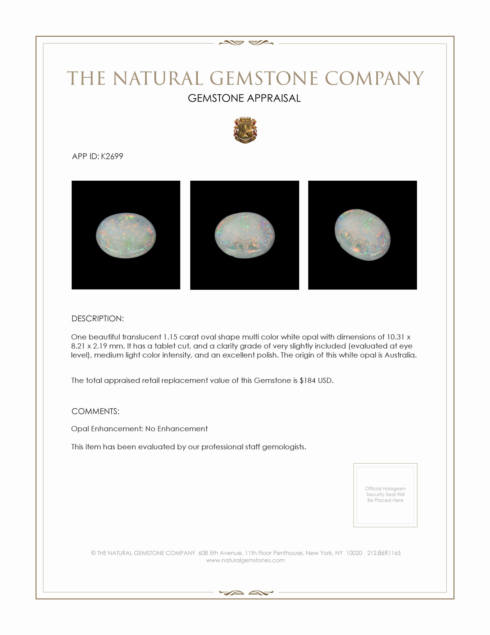 The opal is a gemstone renowned for its captivating play of color and unique appearance, and the opal we're examining displays precisely these traits in abundance. It is a 1.15 carat oval shape opal with a composition that showcases its translucent nature—a characteristic highly sought after by gemstone aficionados. With dimensions measuring 10.31 x 8.21 x 2.19 mm, this opal exhibits a remarkable presence, drawing the eye not just with its size, but with an intricate display of multi-hued colors that shift and change with the angle of view. The Natural Gemstone Company is proud to present such a specimen that truly exemplifies the brilliance and splendor of nature's wonders.