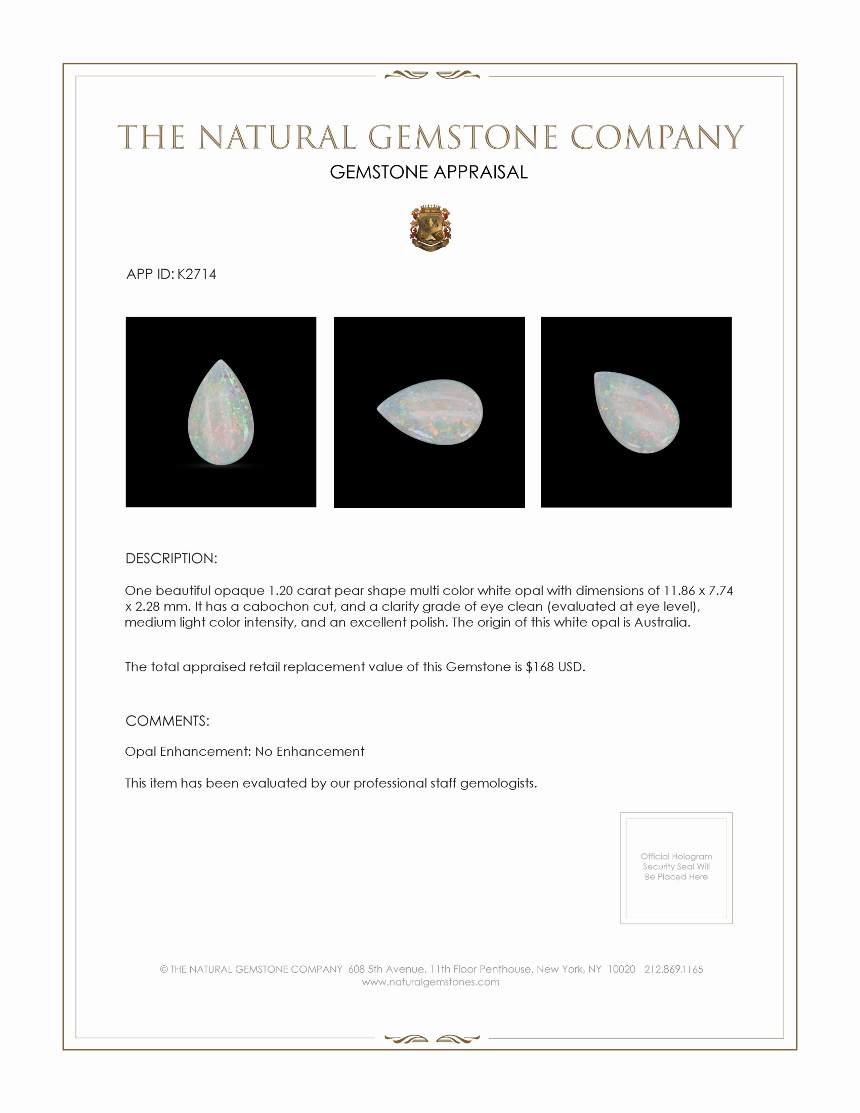 Our featured gemstone, a 1.20 carat pear-shaped opal, captivates with dimensions of purpose and elegance, measuring 11.86 x 7.74 x 2.28 mm. Its cabochon cut is a testament to its fine craftsmanship, having been expertly polished to capture and dance with surrounding light. Tranquil patches of color stream across its surface, reminiscent of a sky painted at dawn, with the medium light color intensity glimmering softly yet undeniably. As an eye-clean gem, the opal's clarity whispers tales of purity and untouched beauty, inviting any gaze to linger upon its surface.