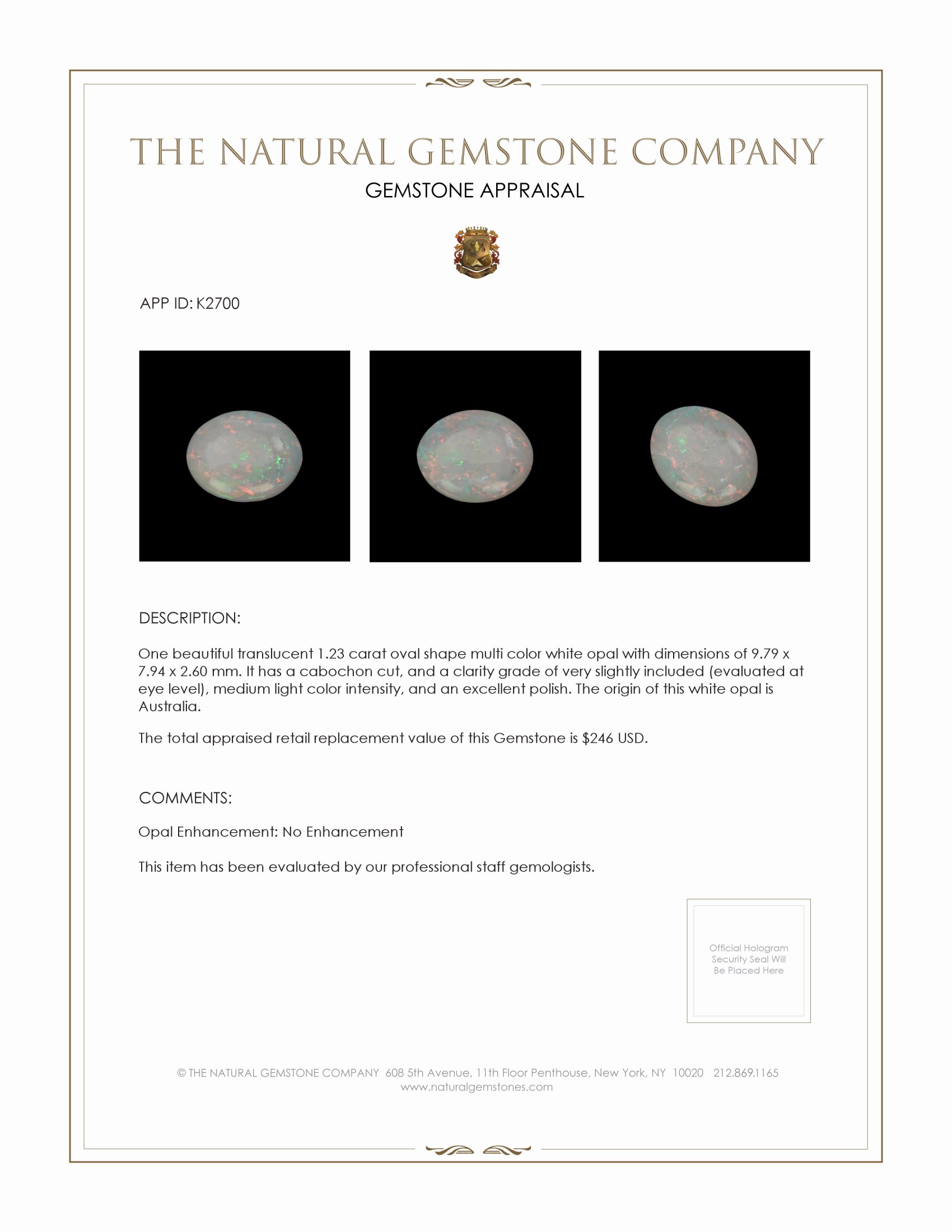 Discover a treasure of exquisite beauty and authentic sophistication with our unique 1.23 carat White Opal, exclusively offered by The Natural Gemstone Company. This opal is a rare gem that promises to enhance any discerning collector's assemblage. Its captivating oval shape and resplendent cabochon cut showcase the play-of-color phenomena that only the finest opals from Australia can provide. Measuring 9.79 x 7.94 x 2.60 mm, this translucent marvel exudes a medium light color intensity, captivating the observer with its kaleidoscope of enchanting hues. With a clarity grade of very slightly included, as evaluated at eye level, it reflects a story of its natural origin and impeccable journey to your collection.