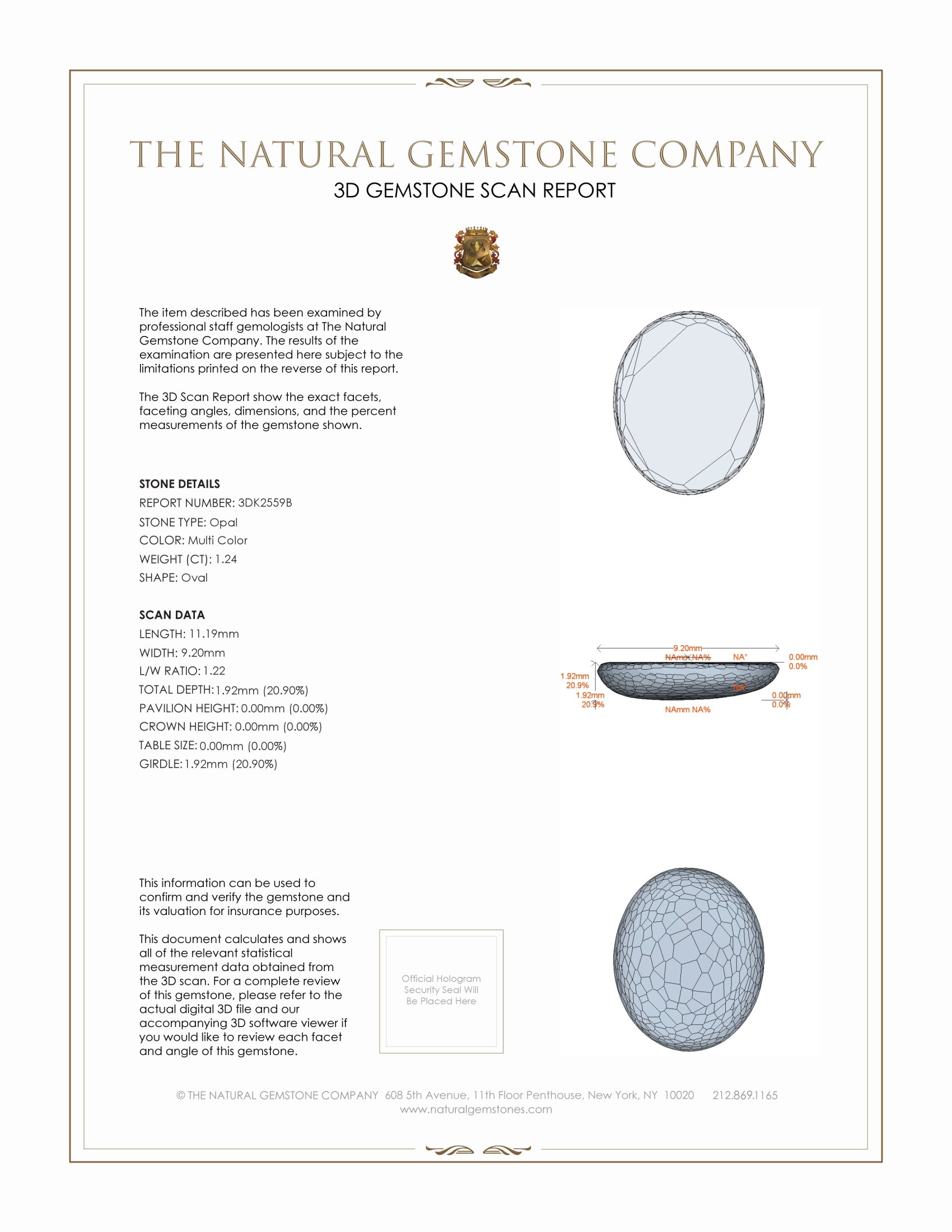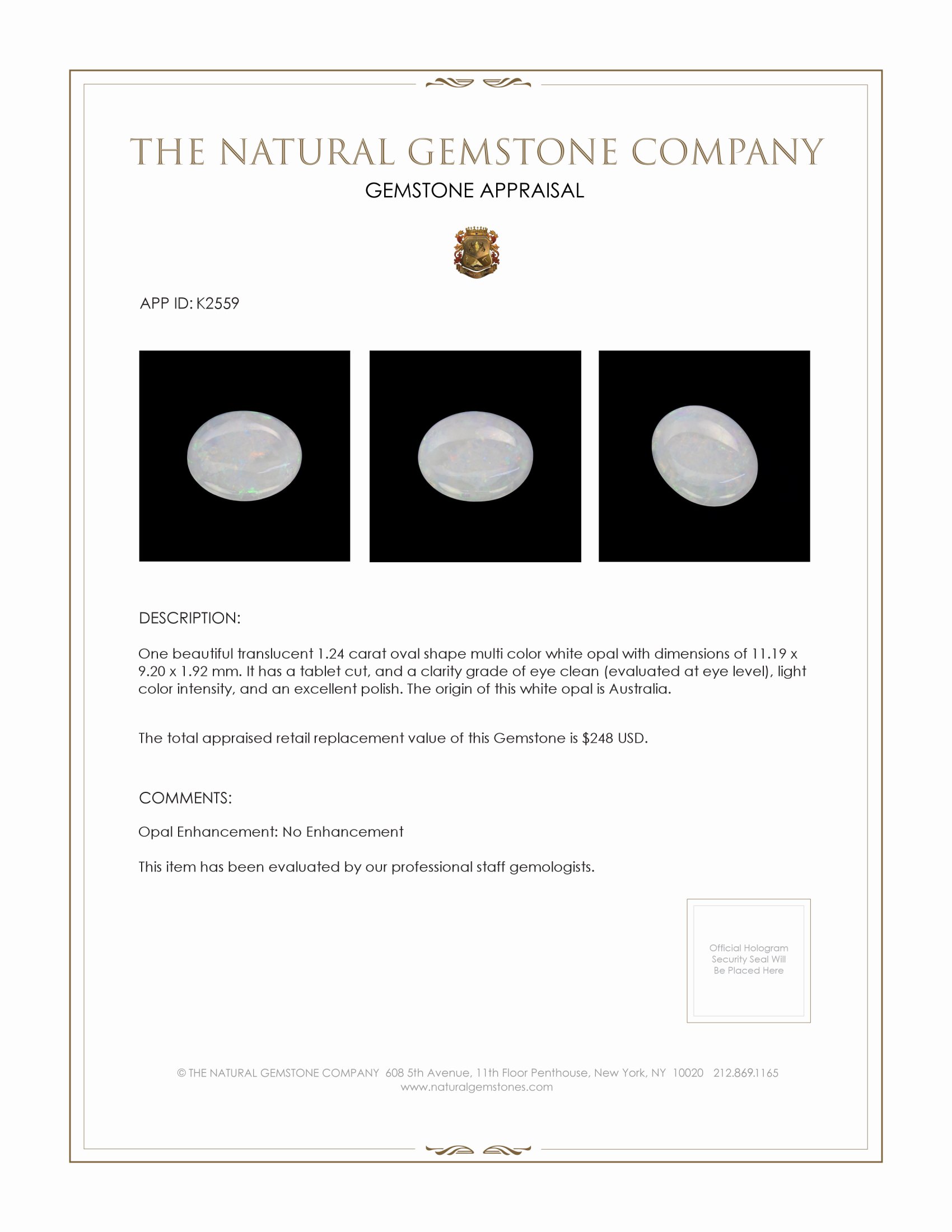 Introducing a truly captivating piece from The Natural Gemstone Company—an exquisite translucent opal that marries natural beauty with an air of mystery and sophistication. This elegant gemstone, weighing in at 1.24 carats, boasts an impressive array of multi-color play of light and vibrant flashes characteristic of premium quality opals. When observed up close, the opal reveals a spectrum of colors that seems to dance across its surface, a unique trait that marks its identity as a white opal from the renowned opal fields of Australia. With precise dimensions of 11.19 by 9.20 by 1.92 millimeters, the opal's carefully executed tablet cut enhances the gem's intriguing light display, ensuring that each angle offers a fresh spectacle of its prismatic nature.