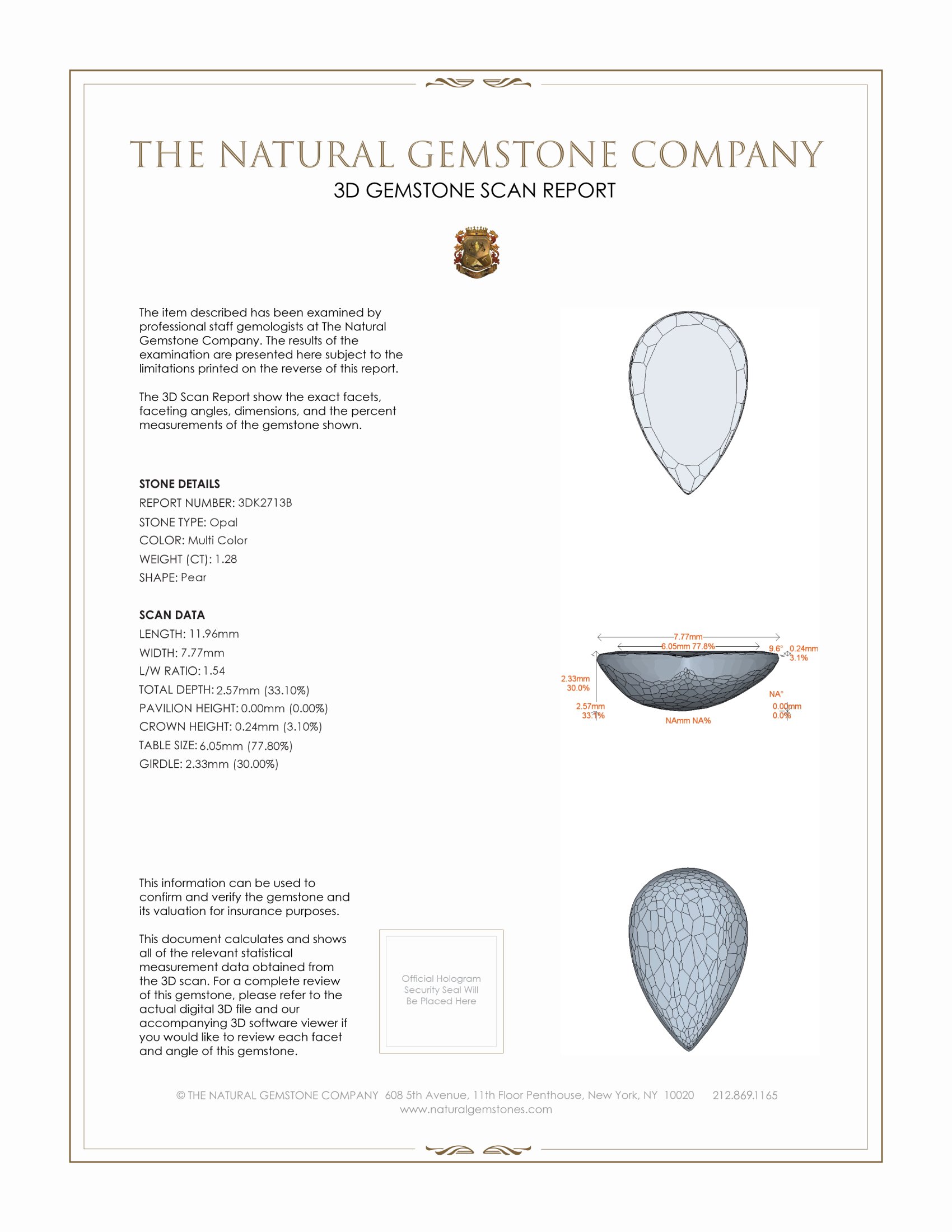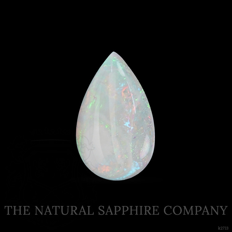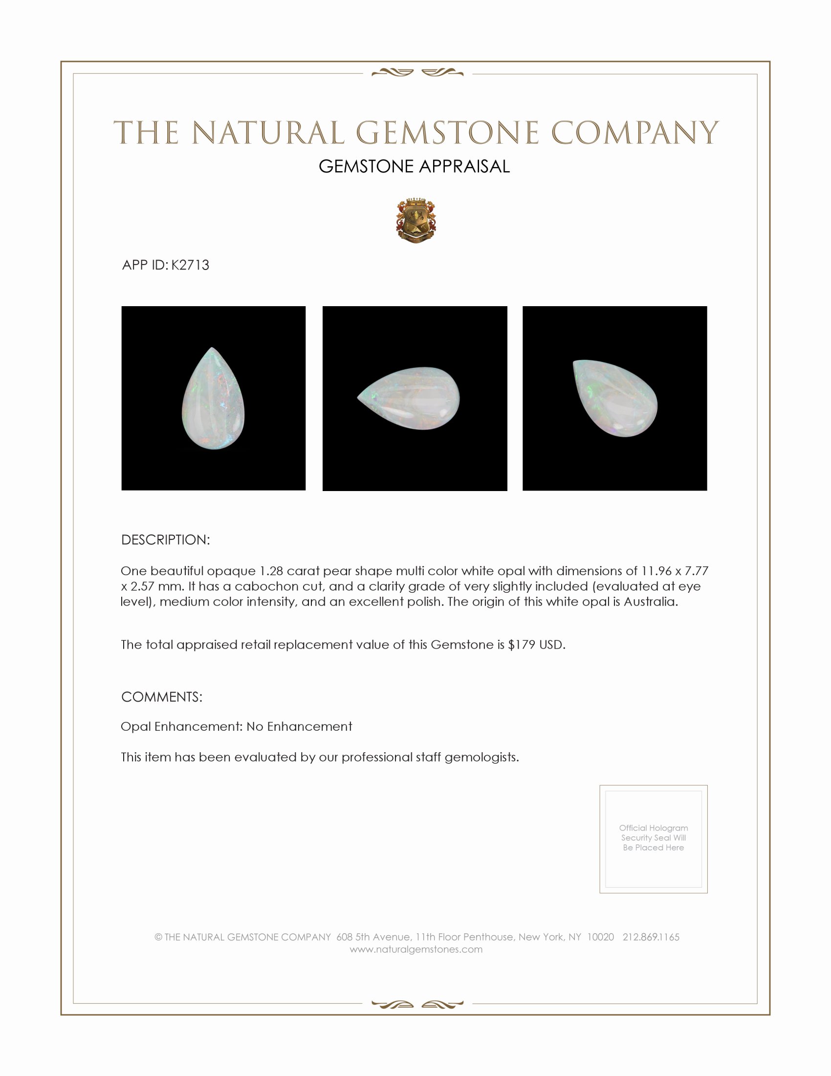 In the heart of Australia’s rich and ancient lands, where whispers of time dance through the wind, an extraordinary gem was born. This beautiful opaque 1.28 carat pear-shaped marvel, a White Opal of mesmerizing allure, rests with hues that echo the breathtaking mystery of the outback’s skies. The way each color splashes through its surface, uniting like a painter’s passionate brushstroke against the horizon, gives life to a masterpiece meant for a soul searching for a connection transcending the ordinary. Encased in its cabochon cut, the opal’s dimensions, 11.96 x 7.77 x 2.57 mm, capture the diaphanous embrace of a rainbow clutching a storm.