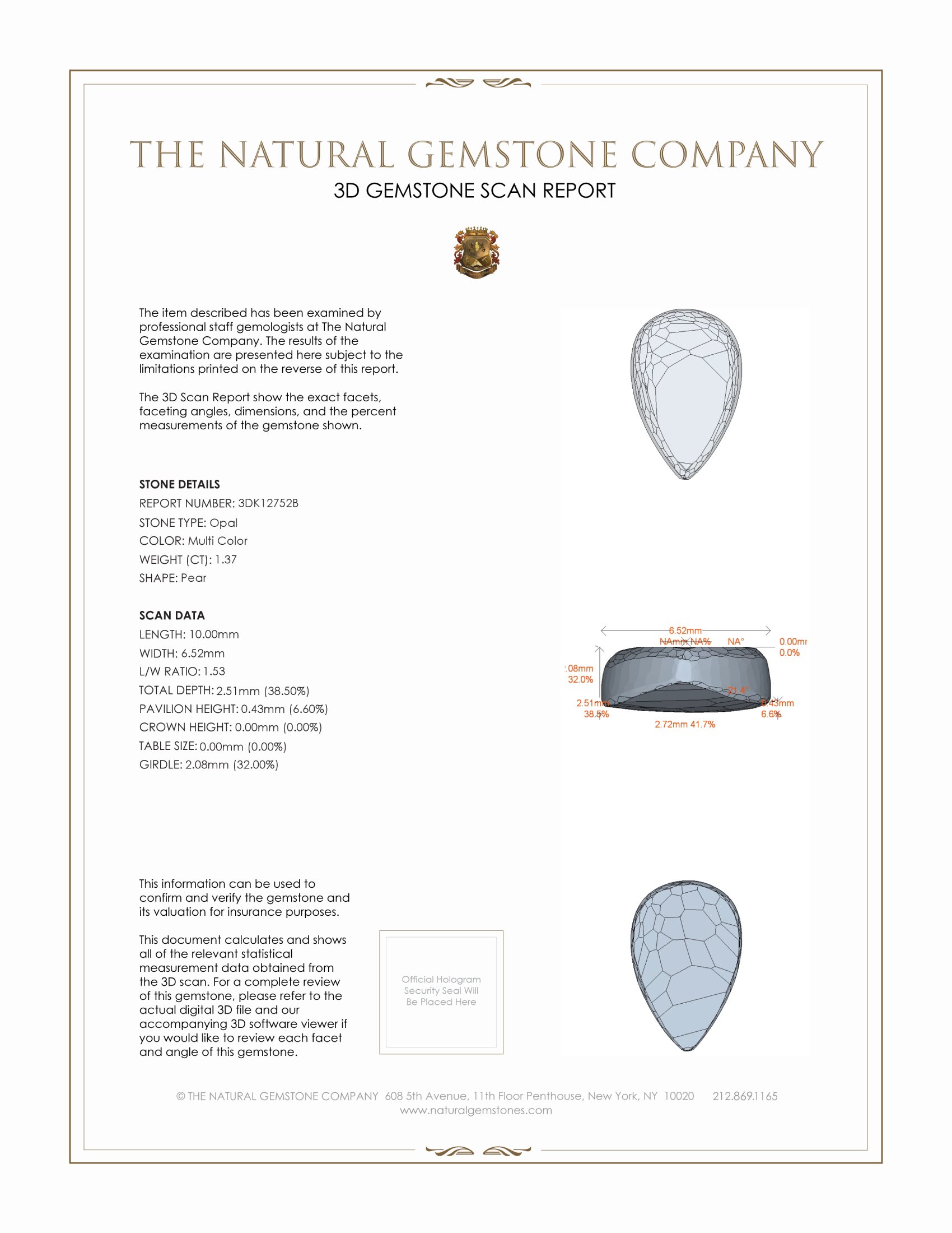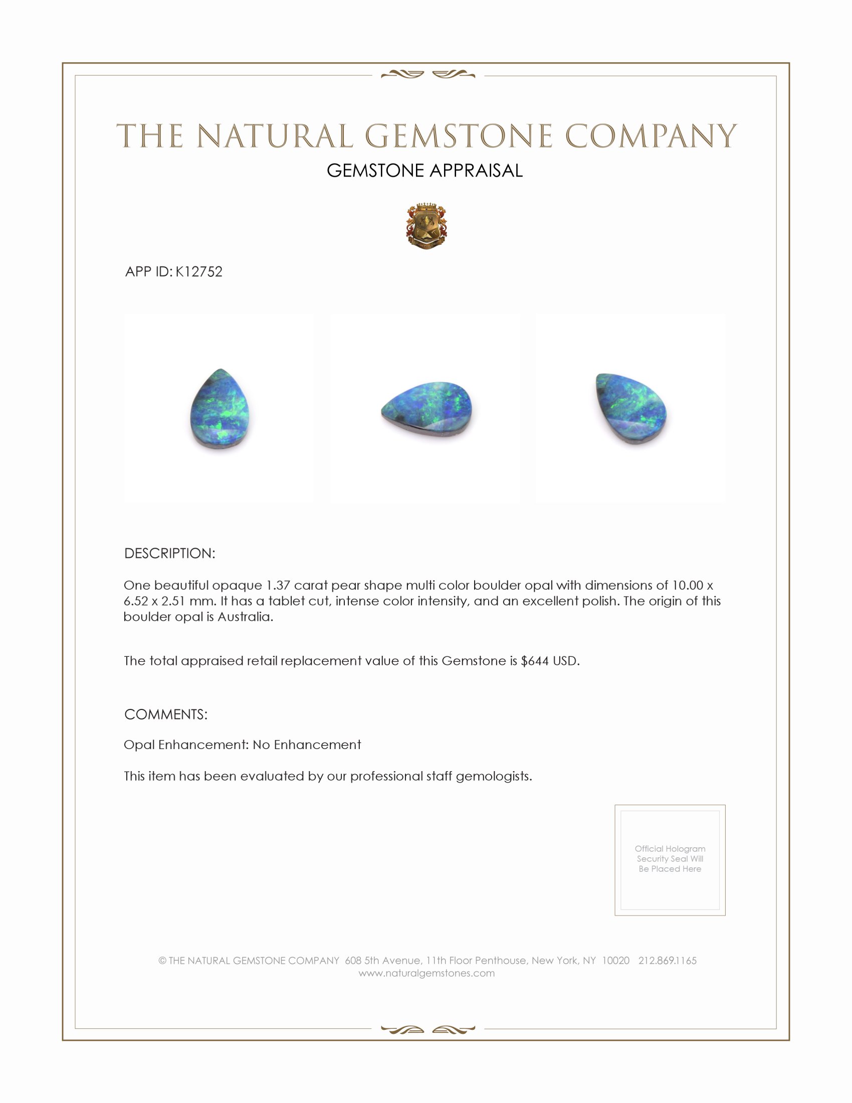 The investment potential of gemstones is an area of increasing interest for discerning investors. Among the various types of gemstones, opals stand out due to their unique allure and historical growth in value. Our featured gemstone is a 1.37 carat pear-shaped multicolor opal, originating from the renowned opal fields of Australia. With dimensions of 10.00 x 6.52 x 2.51 mm, it is a testament to the exquisite craftsmanship and natural beauty associated with opals. The opal has a tablet cut which enhances its visual appeal and showcases its intense color intensity. A hallmark of this opal is its excellent polish, ensuring that it catches the light and displays a captivating play of color.