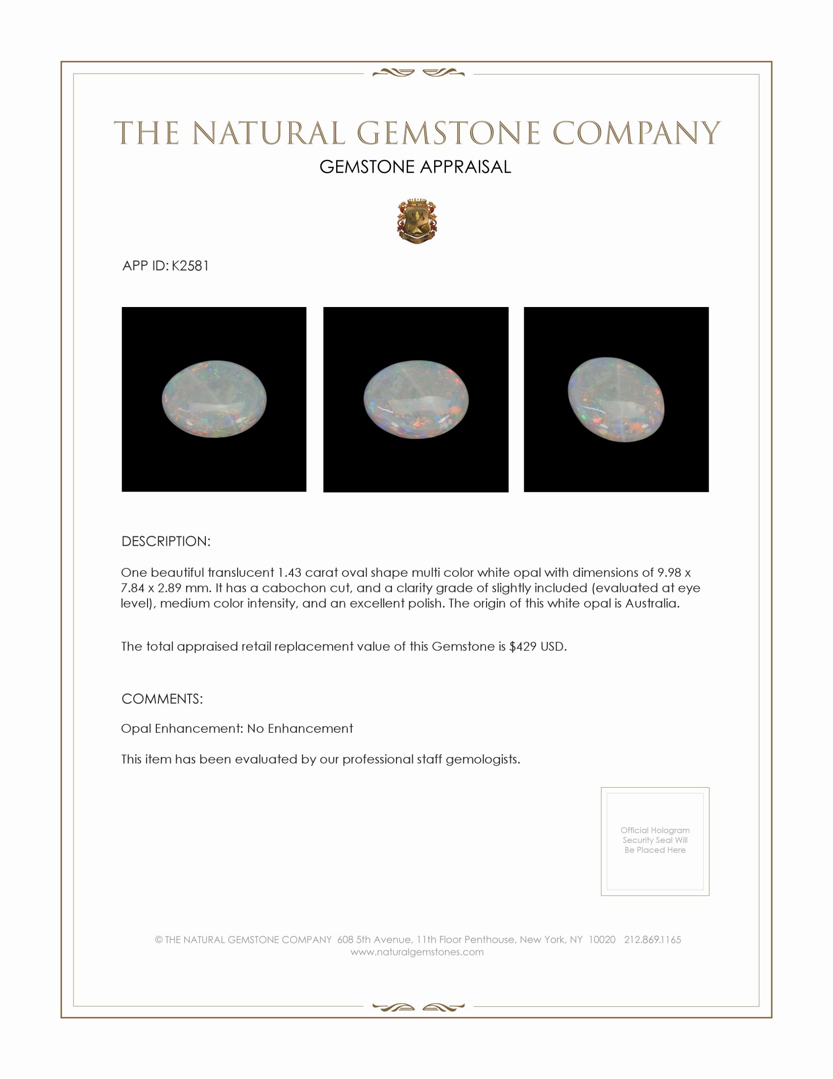 Discover the enchanting allure of our exquisite white opal, a 1.43 carat marvel that embodies nature's artistry in every facet. Skillfully crafted into an oval shape with precise dimensions of 9.98 x 7.84 x 2.89 mm, this gemstone radiates an extraordinary blend of color that captivates and enchants the beholder. The multi-color play of this opal is a sight to behold. Its captivating translucency casts a spell that makes it the centerpiece of any jewelry creation it adorns. The cabochon cut highlights this opal’s innate beauty, allowing the vibrant spectrum of colors to shimmer enticingly with each movement and light refraction.