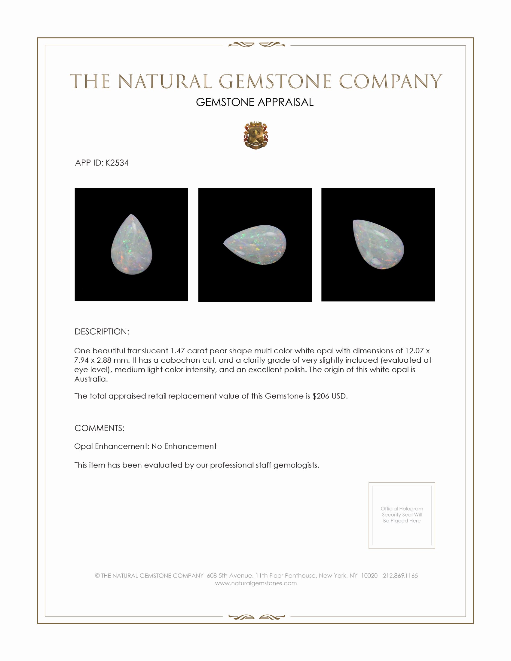 Every inch of this gemstone speaks to the devotion and thoughtfulness behind a perfect gift. With dimensions of 12.07 x 7.94 x 2.88 mm, its symmetrical pear shape offers a sophisticated silhouette that naturally draws attention. It is both elegant and versatile, ideal for custom jewelry that is meant to leave a lasting impression. This opal embodies a soft, luminous glow with medium light color intensity that piques curiosity and admiration. Bystanders won't just see this opal. They'll feel it echoing through their senses.