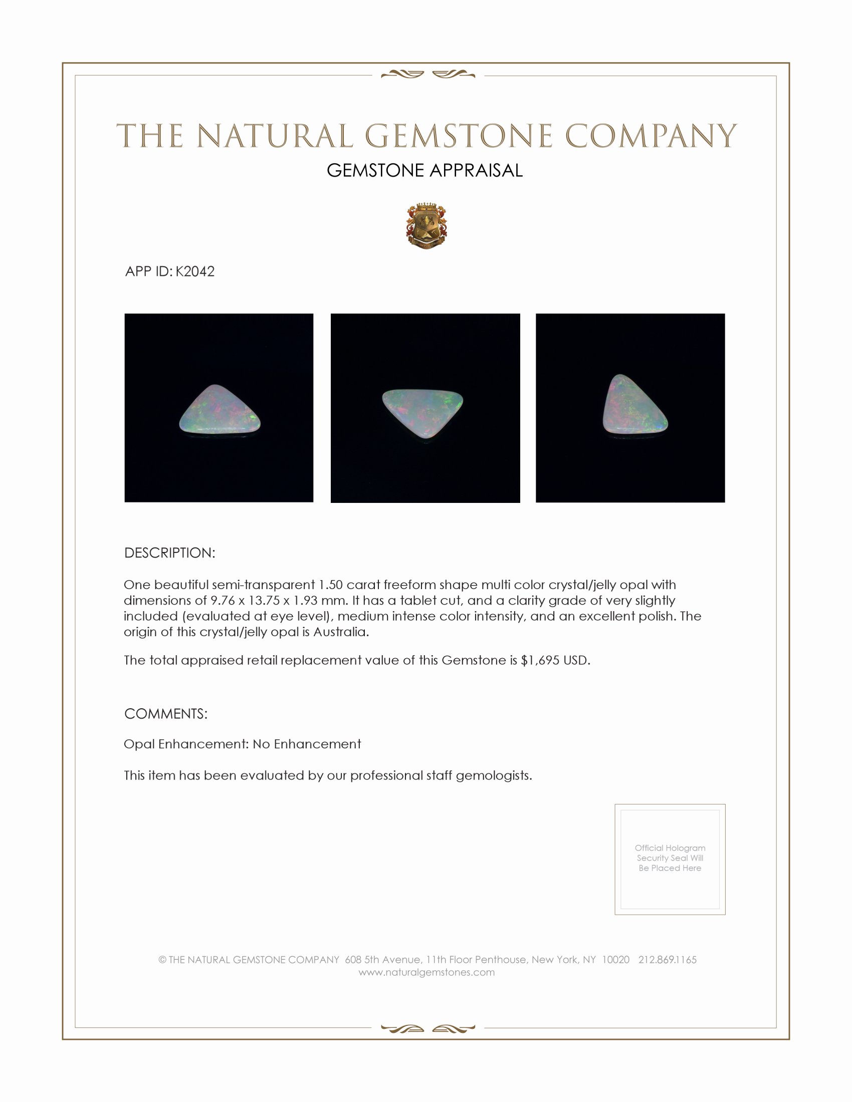 Discover the sheer beauty and timeless allure of a magnificent gemstone crafted by nature itself. At The Natural Gemstone Company, we proudly offer this extraordinary 1.50-carat opal treasure, originating from the mystical heart of Australia. This opal, in its unique freeform shape, measuring 9.76 x 13.75 x 1.93 mm, encapsulates a history as rich and colorful as its appearance. Its graceful tablet cut and medium intense color intensity reflect a commitment to the refined tastes of those who revere tradition and the legacy of classic gemstones. Its clarity grade of very slightly included assures that the opal’s remarkable beauty is not marred by visible imperfections, making it an exquisite choice for any collection or personal adornment.