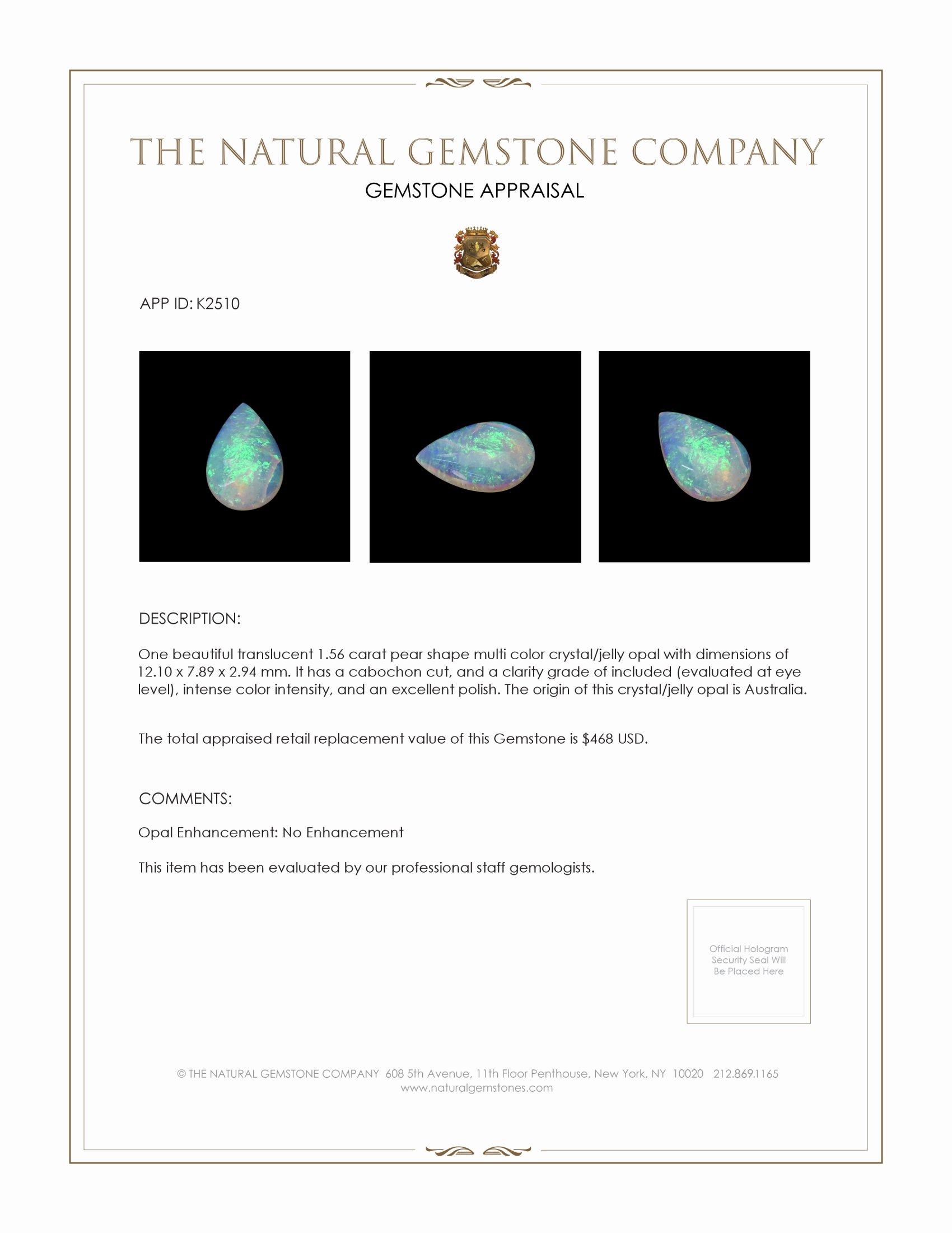 The Natural Gemstone Company presents an exquisite 1.56 carat pear-shaped multi-color opal, a gem that transcends mere adornment to become a centerpiece of any jewelry collection. This opal hails from the rugged terrains of Australia, renowned for producing some of the world’s most captivating opals. With dimensions of 12.10 x 7.89 x 2.94 mm, this white opal features a cabochon cut, which enhances its ethereal play-of-color. The cutting style amplifies the stone’s luminous translucency, inviting light to dance across its surface with mesmerizing intensity. Though it possesses a clarity grade of included—meaning inclusions are visible at eye level—such imperfections should not overshadow the stone's other qualities. Rather, these natural variations are characteristic of the opal type, lending an authenticity that resonates with opal enthusiasts and connoisseurs alike.