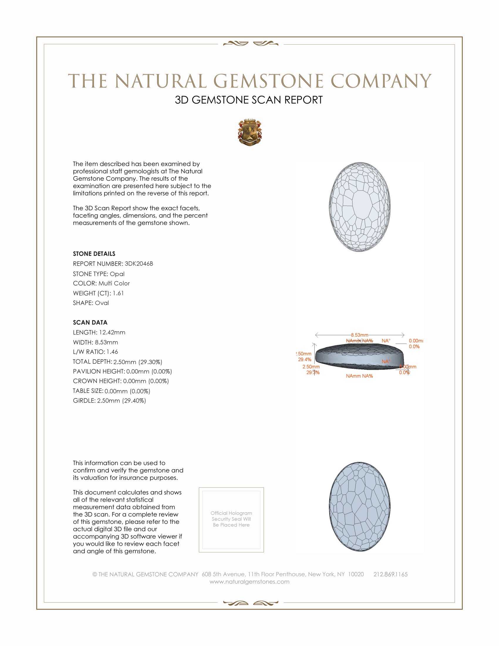 Nestled within the heart of ancient lands and formed through millennia, the opal has captivated civilizations with its ethereal beauty and vibrant spectrum of colors. This semi-transparent 1.61 carat oval shaped multi-color opal, sourced from the rich opal fields of Australia, stands as a testament to nature's artistry and the timeless appeal of gemstones revered by generations. With dimensions of 12.42 by 8.53 by 2.50 mm, this exquisite gemstone exhibits both grace and grandeur, perfect for those who appreciate the enduring legacy that such treasures encapsulate.