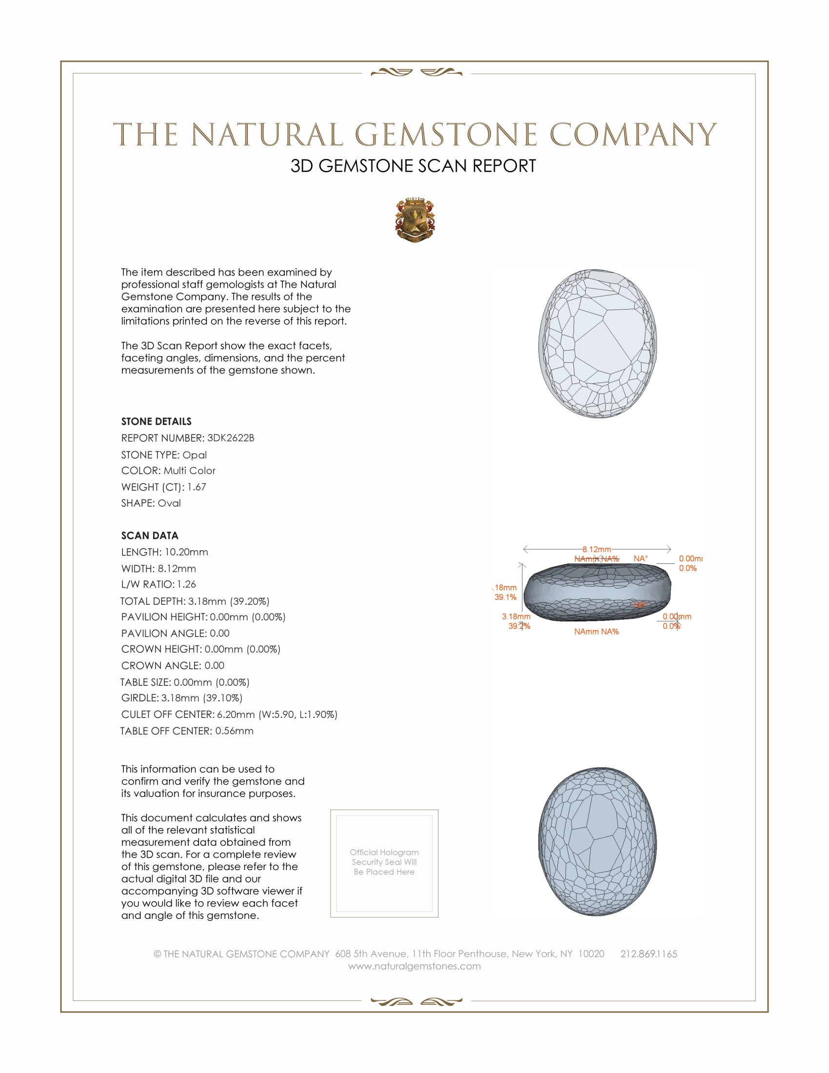 Owning this gemstone is more than an acquisition; it is an investment in timeless elegance and peerless artistry. This opal is not a mere adornment; it is a piece of the Earth’s narrative, a relic that tells a story over millions of years in the making. To possess it is to embrace a piece of history, a whisper of the mythical origins that shaped its unique character. The Natural Gemstone Company presents this exclusive treasure to those who recognize the beauty of rarity and the value of sophisticated craftsmanship. A testament to human and natural collaboration, this gemstone is seen as a cherished heirloom to be passed down, appreciated by generations to come.