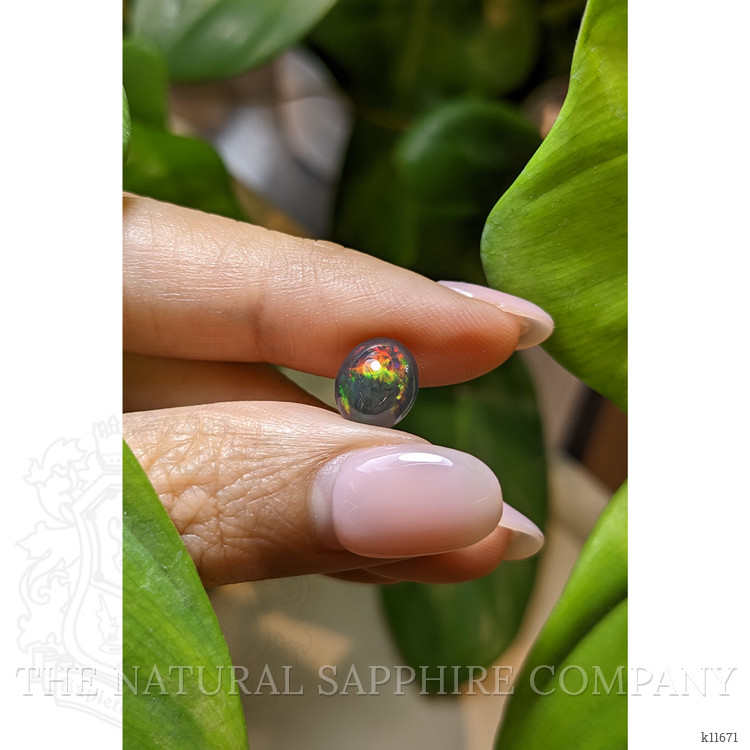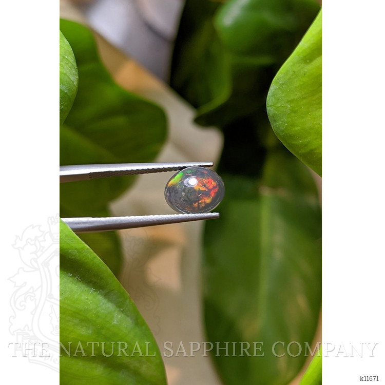 Introducing a masterpiece from The Natural Gemstone Company, our exquisite 1.68 carat Ethiopian Black Opal, an embodiment of sophistication and timeless allure. This one-of-a-kind gemstone is more than a mere ornament; it is a testament to the beauty and magnificence of the natural world, a celebration of the Earth's innate artistry. Its captivating opaque surface, an ethereal blend of multicolor hues ranging from deep blues to fiery reds, is accompanied by a cabochon cut that evokes a sense of serene elegance. With a precision-polished surface that boasts an excellent polish and an eye-clean clarity grade, this opal is destined to be the crown jewel of any luxurious collection.