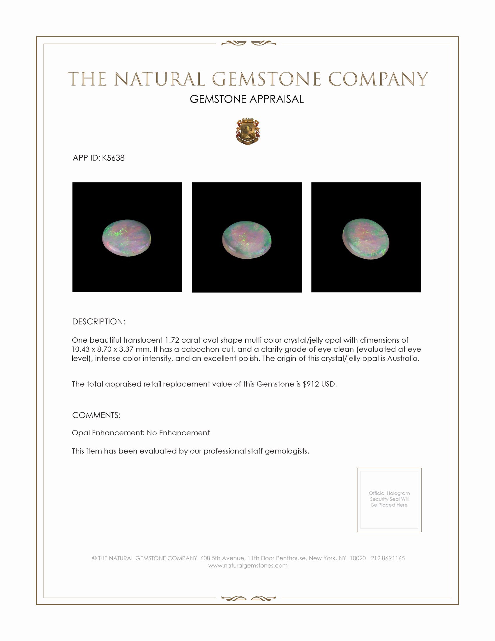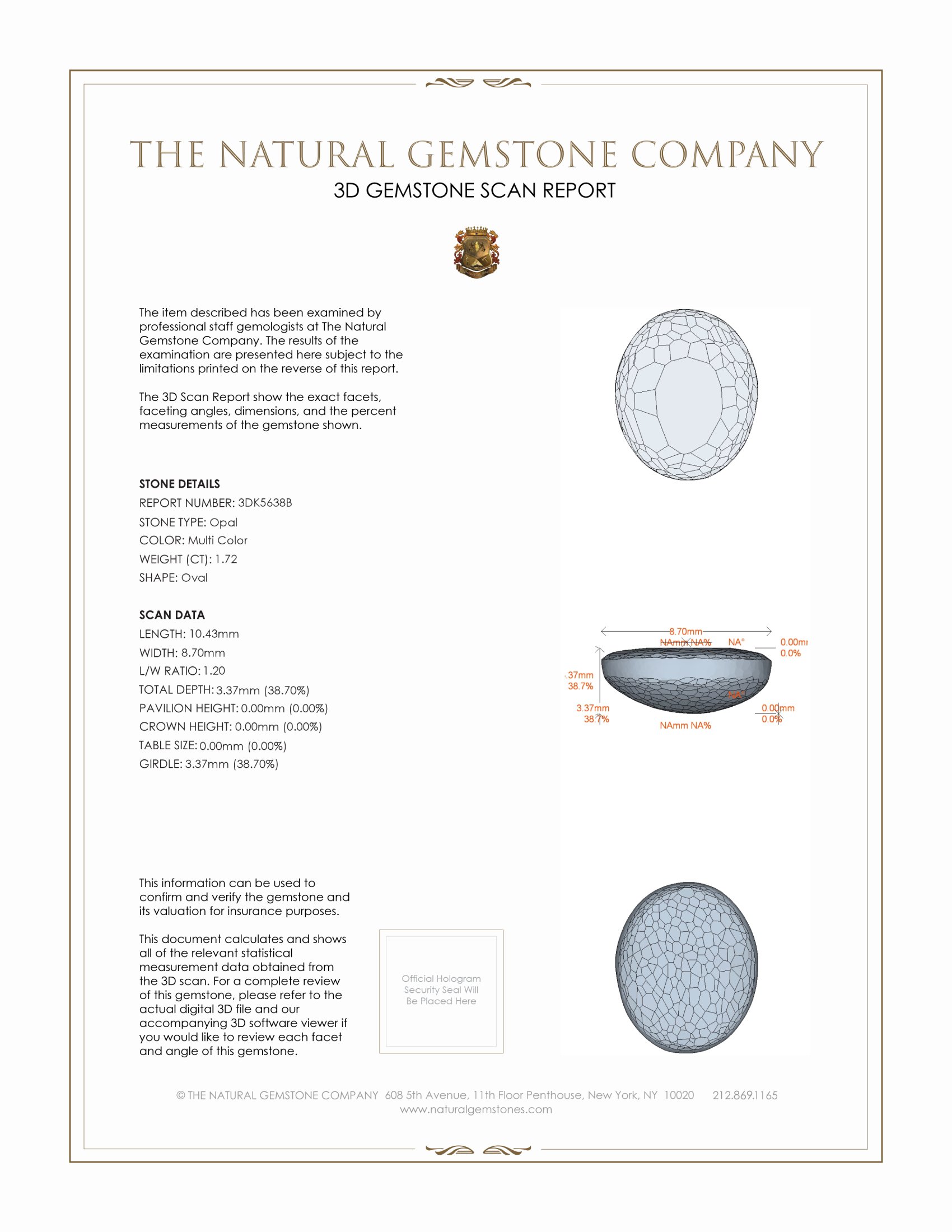Discover the exquisite beauty of our 1.72 carat oval-shaped multi-color opal, a gemstone that seamlessly merges elegance with ethical sourcing. This stunning opal, with dimensions of 10.43 by 8.70 by 3.37 mm, promises to captivate those in search of the perfect addition to a conscious consumer’s collection. As you look into the depths of this crystal opal, its translucent quality reveals an enchanting play of colors, offering an intense color intensity that can only be described as mesmerizing. Its cabochon cut enhances its natural beauty, while the clarity grade, evaluated at eye level, ensures an eye-clean finish. The excellent polish of this opal is a testament to the precision and skill invested in its preparation, highlighting every facet of its natural charm.