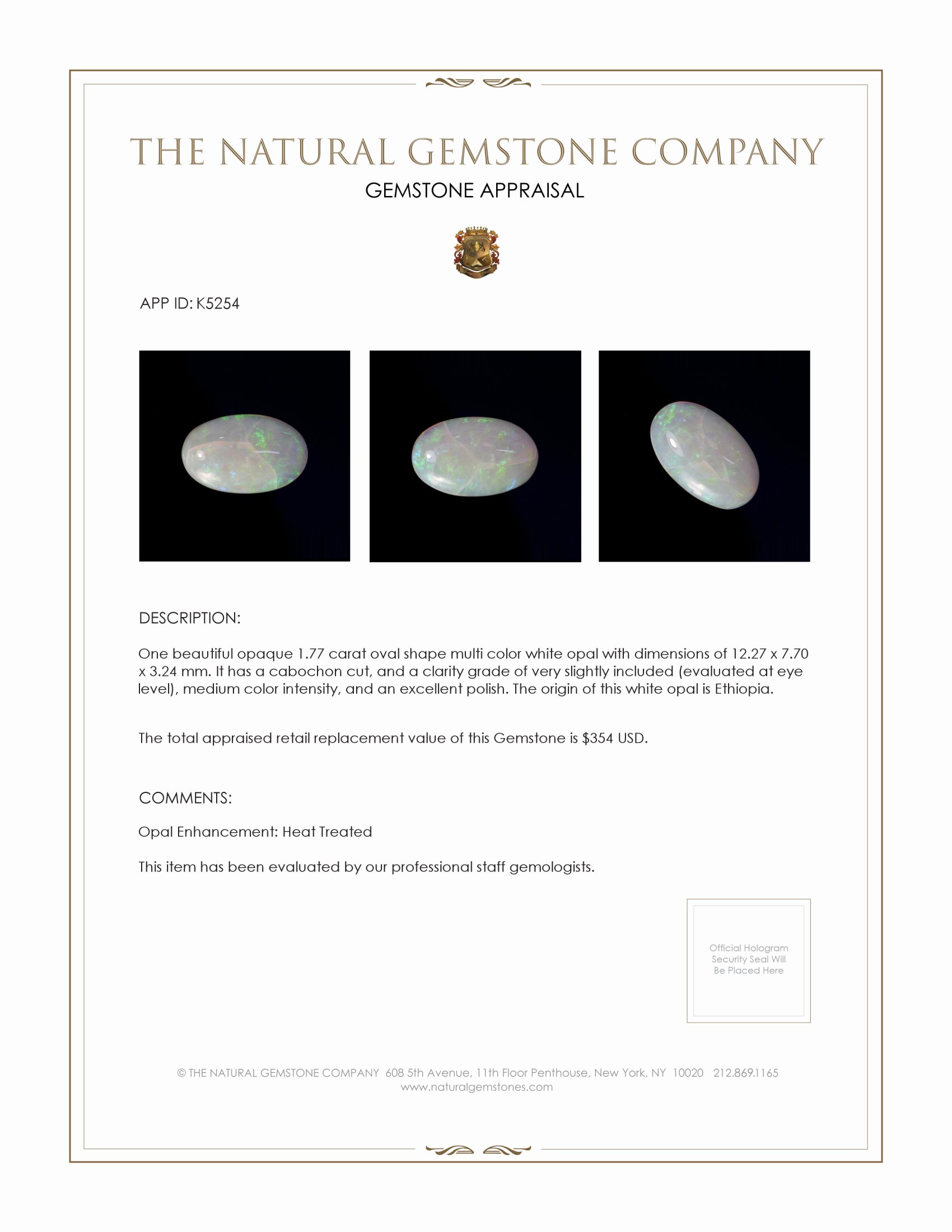 Introducing an exquisite gem that captures both the beauty and integrity of nature, this opaque 1.77 carat oval-shaped multi-color opal offers a brilliant addition to any discerning collector's array. Ethically sourced from the renowned mines of Ethiopia, this white opal is a testament to both Mother Nature's artistry and the meticulous craftsmanship devoted to responsible jewelry making. Displaying dimensions of 12.27 x 7.70 x 3.24 mm, its size is ideal for various jewelry applications, from statement pendants to elegant rings, thus adding a touch of opulence to your collection.
