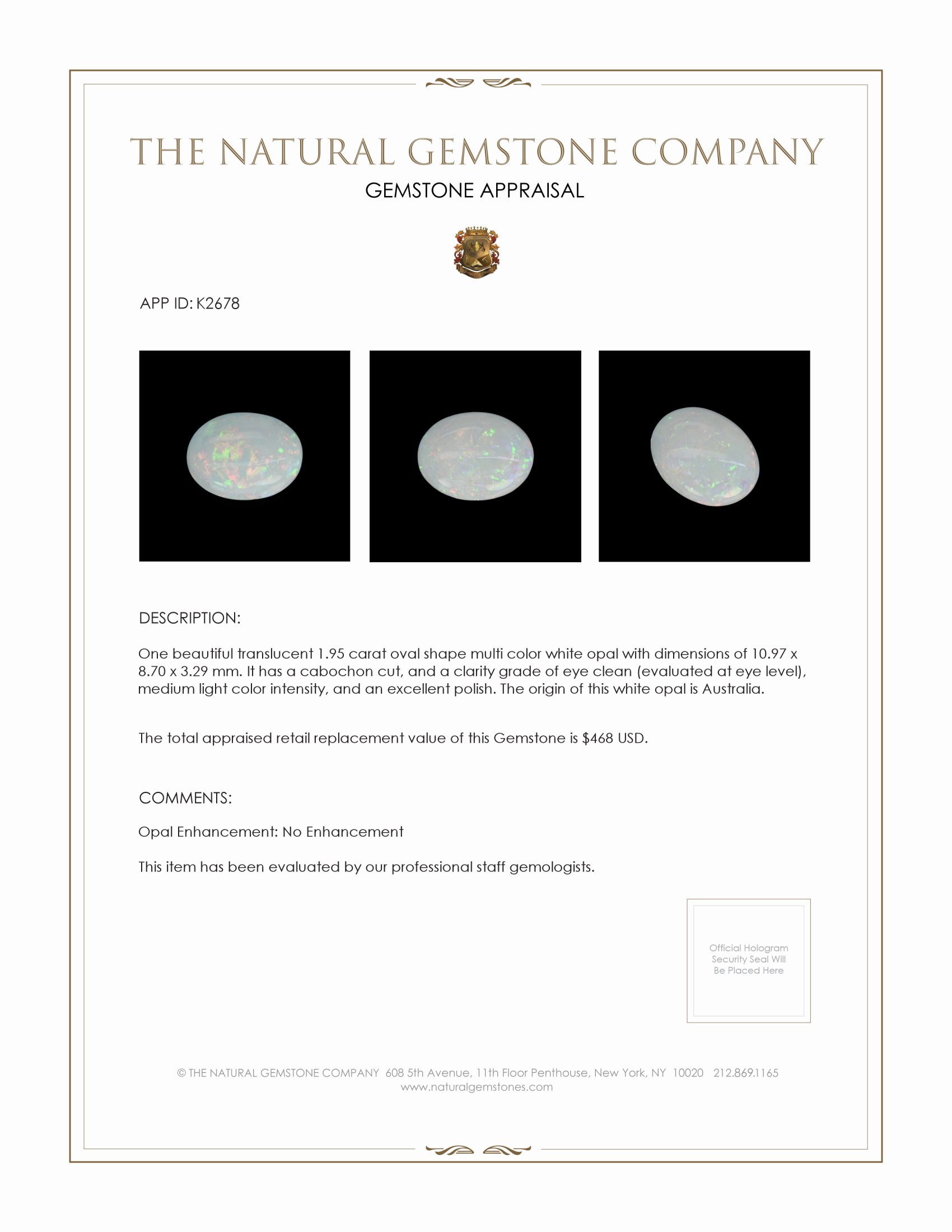 This white opal hails from the renowned gemstone origins of Australia, bringing with it an authentic and time-honored legacy. Adorned with a rich, bold color, its medium-light intensity captures the eye and invites admiration. The translucent material further highlights a stunning play of colors that dance beneath its pristine surface, evoking the rare visual phenomenon known only to those familiar with such treasures. The clarity grade of eye clean ensures an immaculate view, free from visual blemishes when seen from eye level, lending it an unmatched quality that distinguishes it from ordinary gems.
