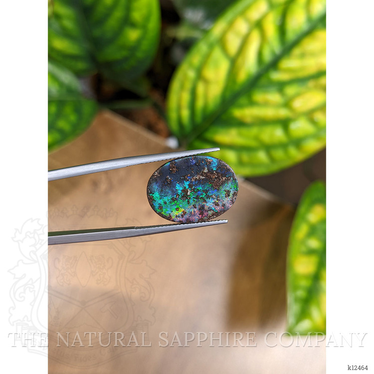 Introducing a rare masterpiece transcending the ordinary, an 11.58-carat oval-shaped, multi-color opal from The Natural Gemstone Company. This exquisite boulder opal, originating from the lush terrains of Australia, represents the pinnacle of natural artistry. With its dimensions, 19.98 x 14.63 x 4.44 mm, this opal captivates with its enchanting play of colors, a signature feature only nature can master. Crafted with a tablet cut, this gemstone reflects an intense color depth and radiates the luxurious craftsmanship seen through its excellent polish. Here lies not just a gemstone, but a tale crafted from the depths of Earth's history.