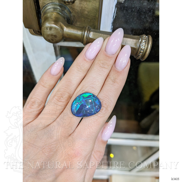 This opal, an impeccable black opal, a rare treasure found in only a select few places across the globe, encapsulates all the mystery and allure associated with its age-old companions. Its remarkable spectrum of colors, alive with vivid intensity, speaks to the ancient belief that opals possess the power to amplify one's inner and outer beauty, a stone historically revered by royalty and nobility. Its tablet cut, precise and deliberate, mirrors ancient relics and yet showcases a modern elegance that places this opal in a league reserved for discerning collectors.