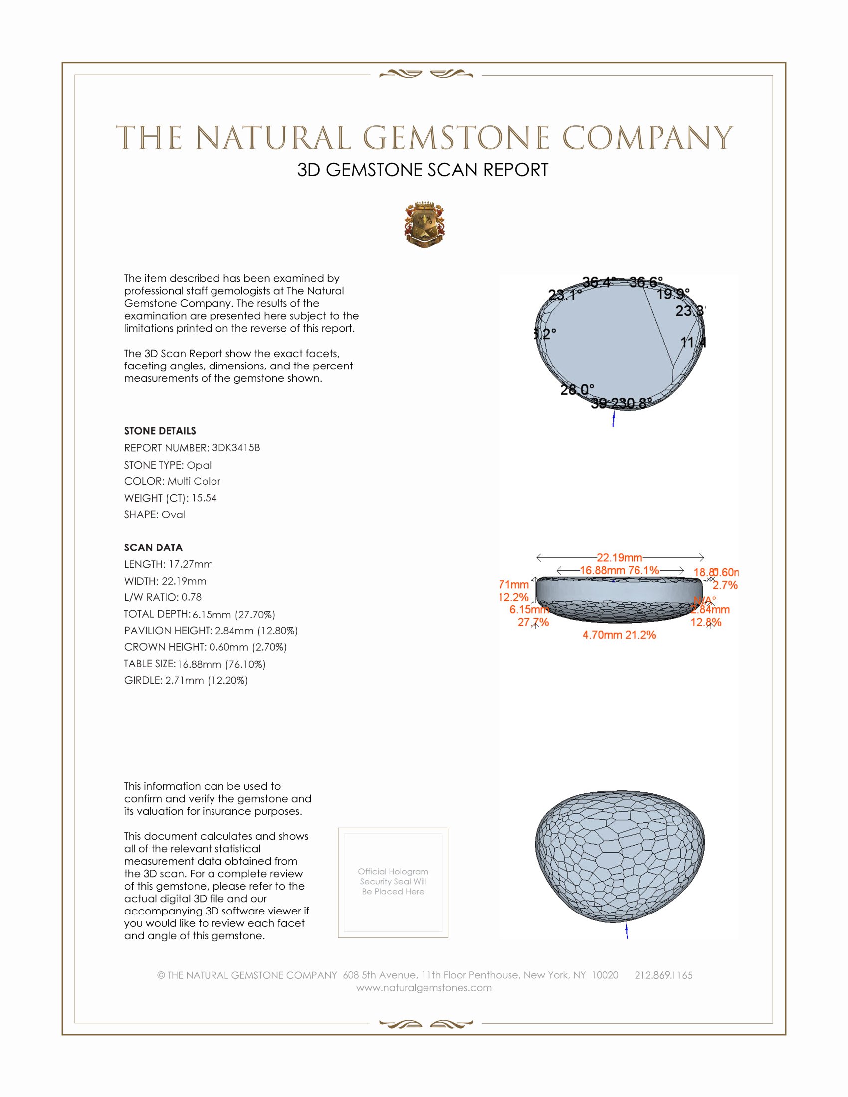 In an era where the pursuit of uniqueness has become a quest of its own, this 15.54 carat treasure sets itself apart as a symbol of exclusivity. Measured precisely at 17.27 by 22.19 by 6.15 mm, this opal possesses a clarity that enchants from every angle, allowing its owner to see the world through a lens of eye clean beauty. As the light catches its flawlessly polished surface, revealing its vivid play of colors, one is reminded of stories about rare trinkets passed down through generations, heirlooms that never age.