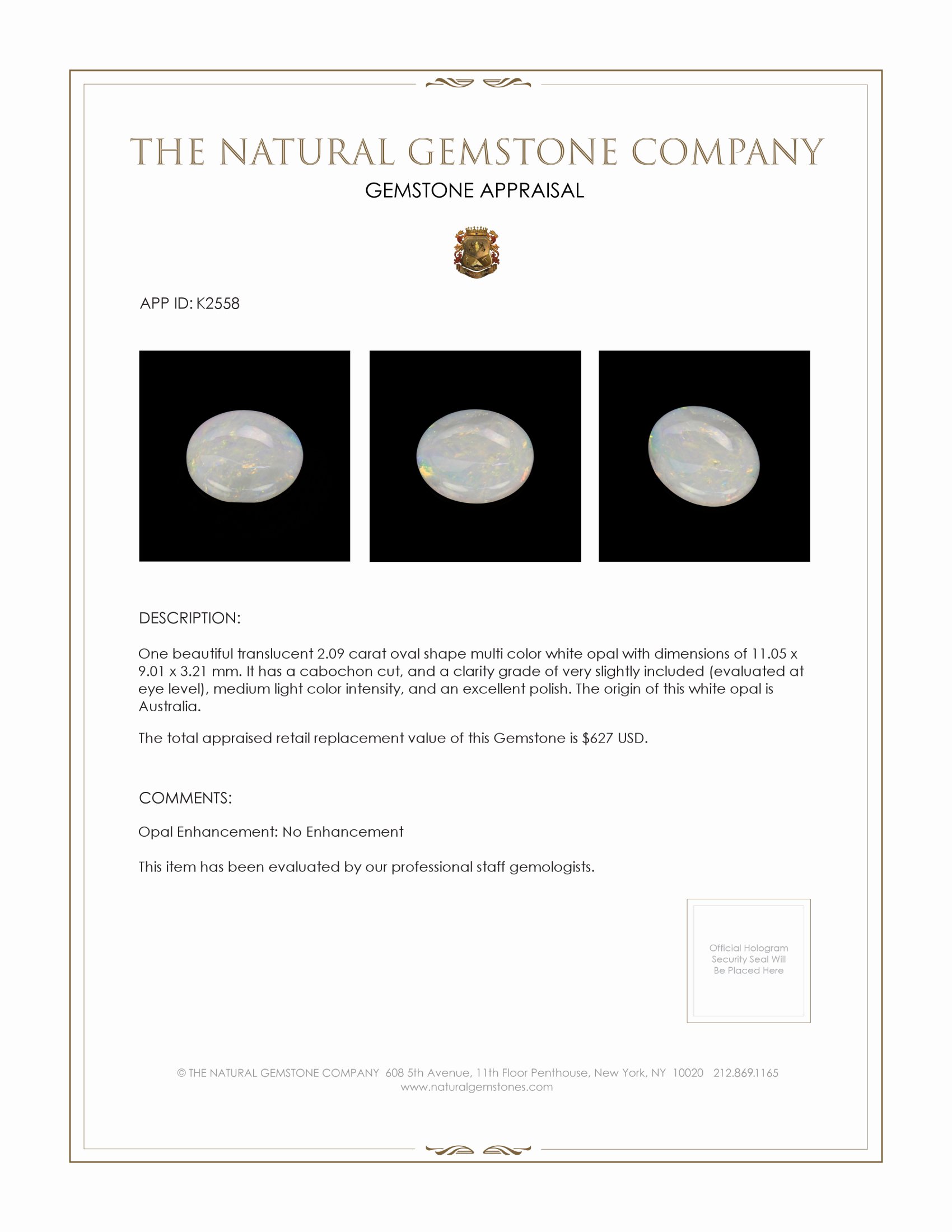 Allow yourself the indulgence of marveling at this opal's translucent splendor. Measuring 11.05 x 9.01 x 3.21 mm, it is a gem whose beauty knows no bounds. The oval shape, classic and timeless, is gracefully cut en cabochon—a technique that has celebrated opals for centuries, highlighting their inherent play-of-color. Imagine the opal resting against your skin or catching the light from a soft summer evening, each facet delicately alive, shifting through a spectrum of dance-like hues, unique yet beautifully harmonious with each glance.