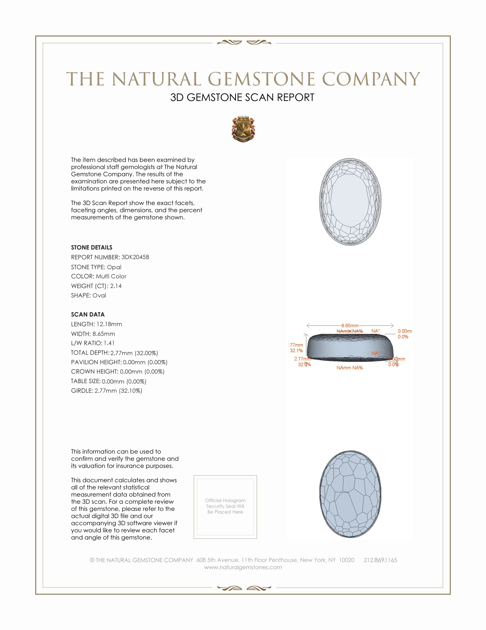 In the heart of Australia, where time pauses and the earth whispers ancient secrets, a gem of unparalleled beauty emerges, offered to the world by The Natural Gemstone Company. This exquisite 2.14 carat crystal opal is like a fragment of a dream nestled within the earthly embrace of a semi-transparent veil. Imagine an opal with dimensions as alluring as 12.18 x 8.65 x 2.77 mm, cradling zephyrs of color that dance across its smooth, tablet-cut surface. Its medium intense hues shimmer with a mystical fire, capturing the very essence of nature's breathtaking palette in a hypnotic ballet of light and shadow.