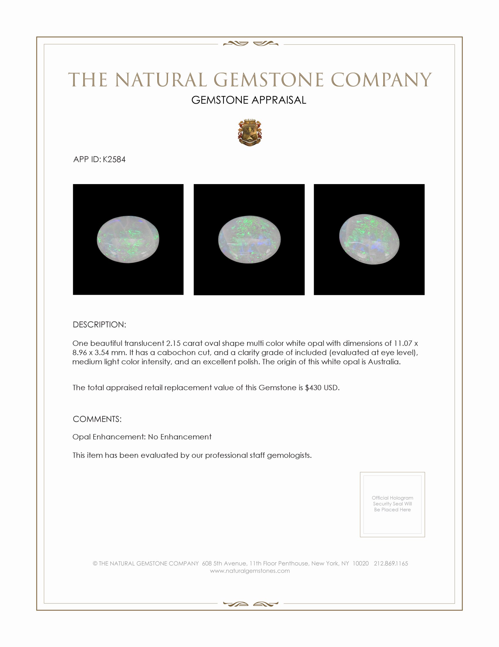 Bathed in the whispers of morning dew and kissed by the pale fingers of dawn, this exquisite opal ensures that romance and magic are never far from your touch. Imagine holding in your palm a celestial canvas where the colors of twilight flirt playfully with the warmth of a summer's sunset. Such is the enchanting allure of our 2.15 carat white opal, tenderly crafted into an oval that cradles nuances of multi-color dreams. Hailing from the heartland of Australia, where earth and spirit blend in gentle unity, this cabochon-cut gemstone embodies nature's artistry.
