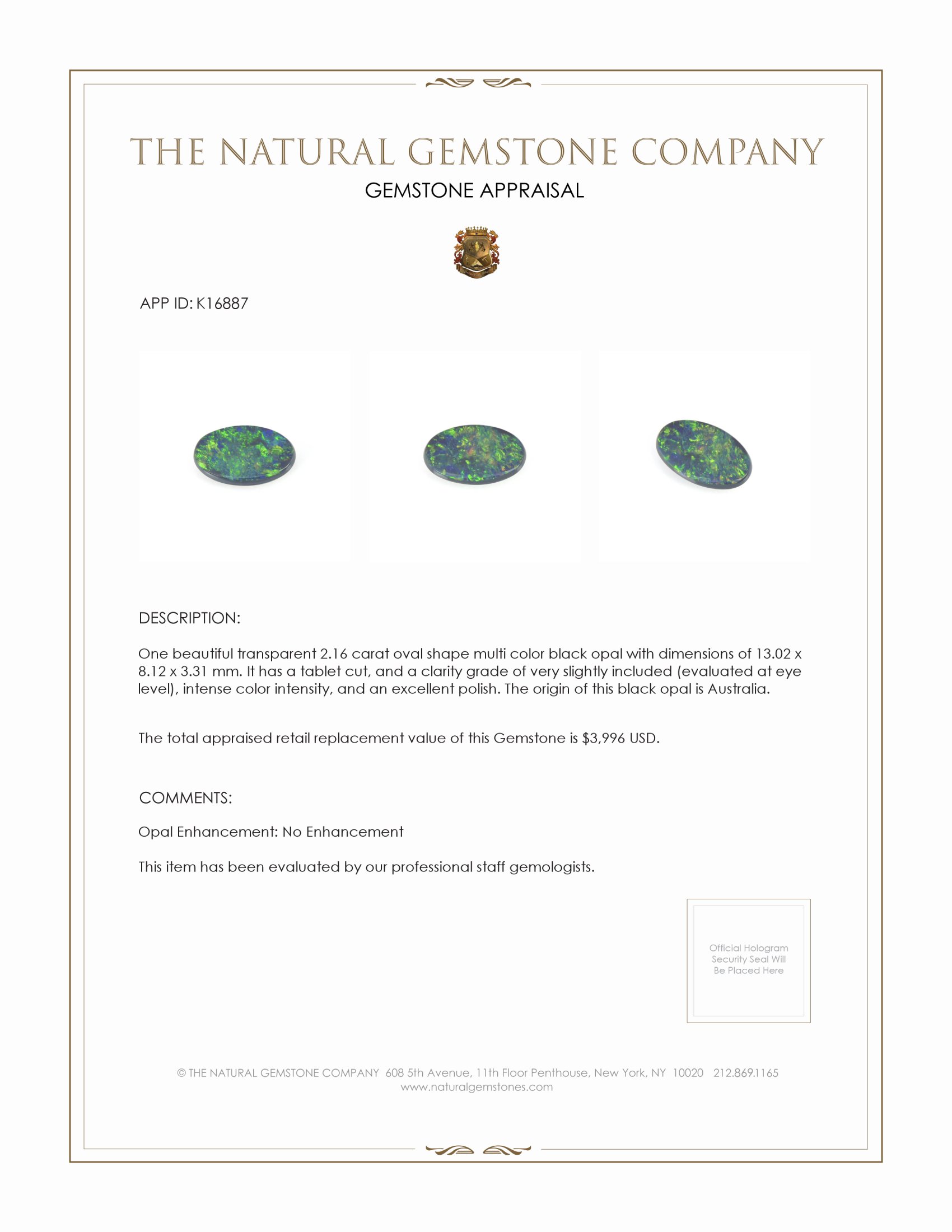 From the sun baked fields of Australia to the quiet precision of our lapidary studio, this Black Opal tells a layered story, a journey that begins in ancient silica rich sands and ends as a luminous jewel kept by The Natural Gemstone Company, The gem began its life as a concentrated slurry of silica and water, folding and hardening over millennia until the unique arrangement of silica spheres formed a living play of color. Mined with care in Australia, its transparent body reveals a multicolor symphony that seems to move with every tilt, an intense color intensity that speaks to both the depth of its origin and the purity of its form. The 2.16 carat oval measures 13.02 x 8.12 x 3.31 mm, and its tablet cut was chosen to celebrate the gem as both a window and a stage, amplifying flashes of emerald, sapphire, fire and amber while preserving the opal as a durable, wearable treasure.